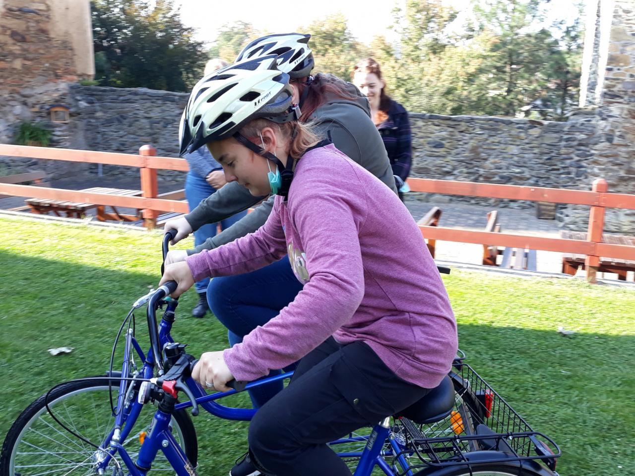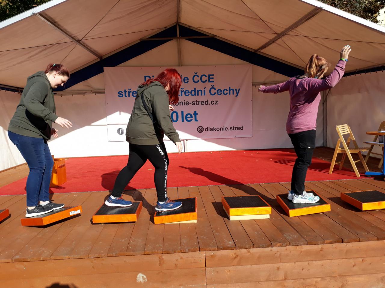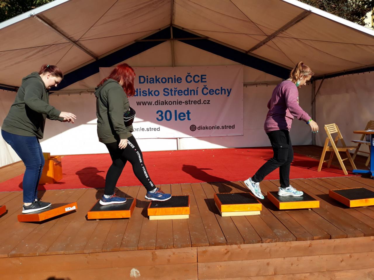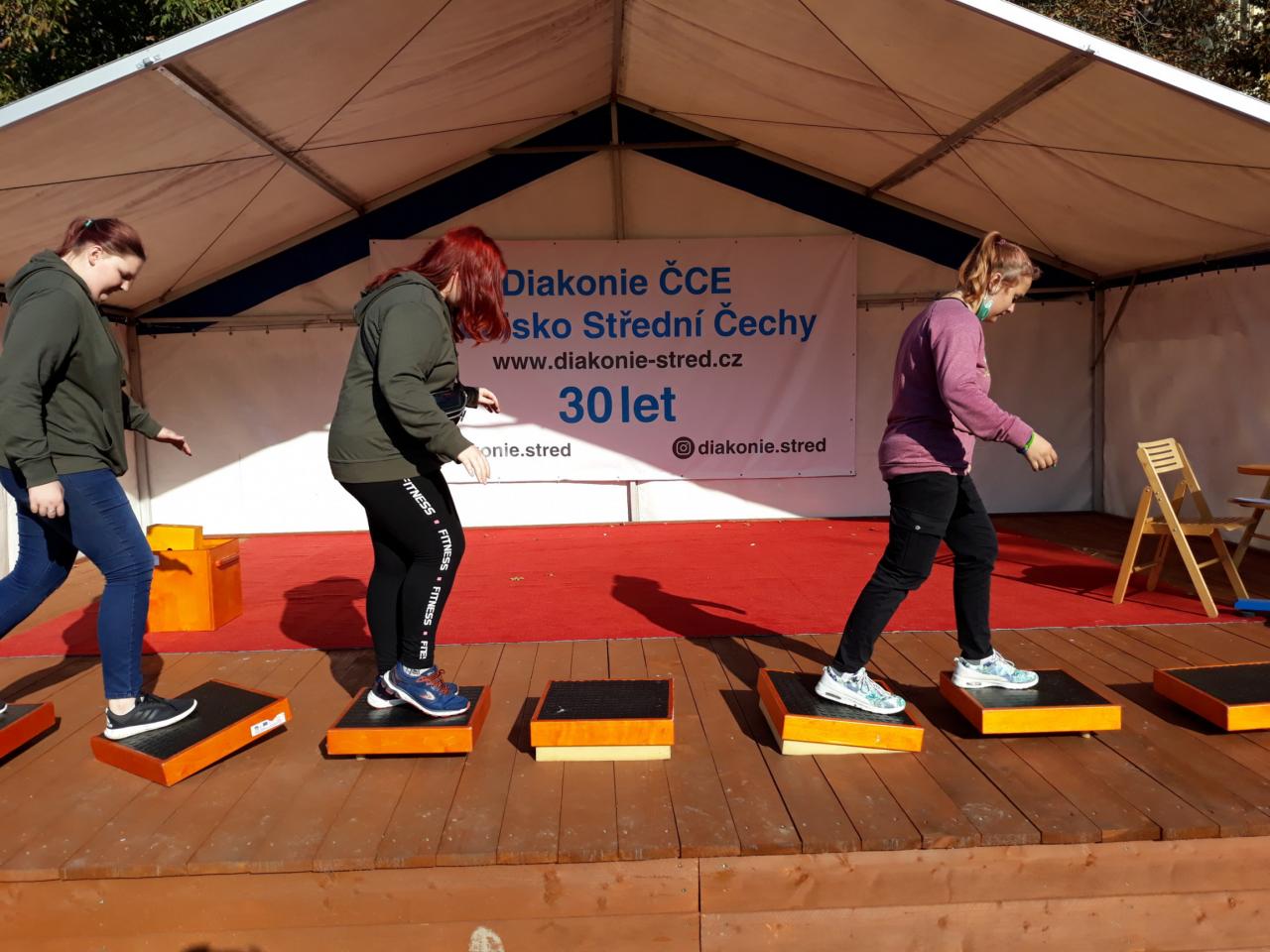 Venku na zahradě si dívky mohly vyzkoušet ovládání invalidního vozíku, projet se na speciálním tandemovém kole, projít přes balanční stezku a složit díly do bedny (to se nám nepovedlo). Na závěr jsme si vyzkoušely lis na odznaky a vyrobily si vlastní placku s logem 30. výročí Diakonie v Čáslavi.