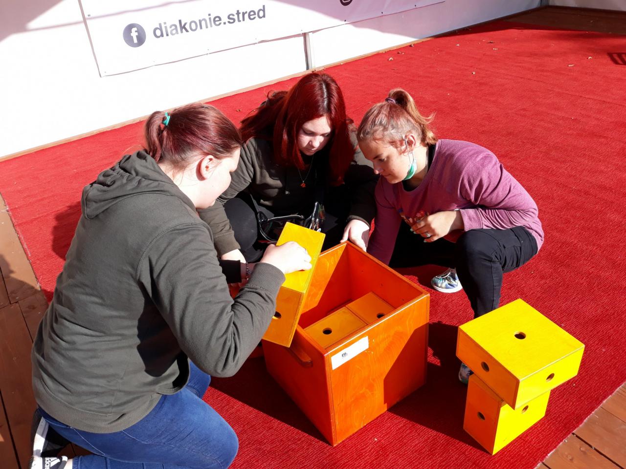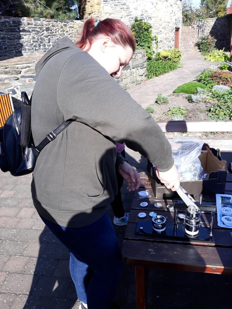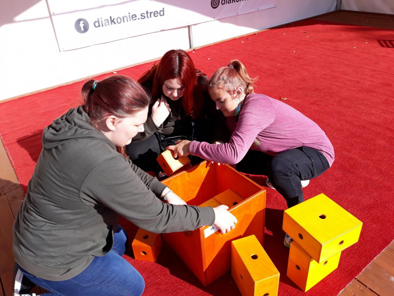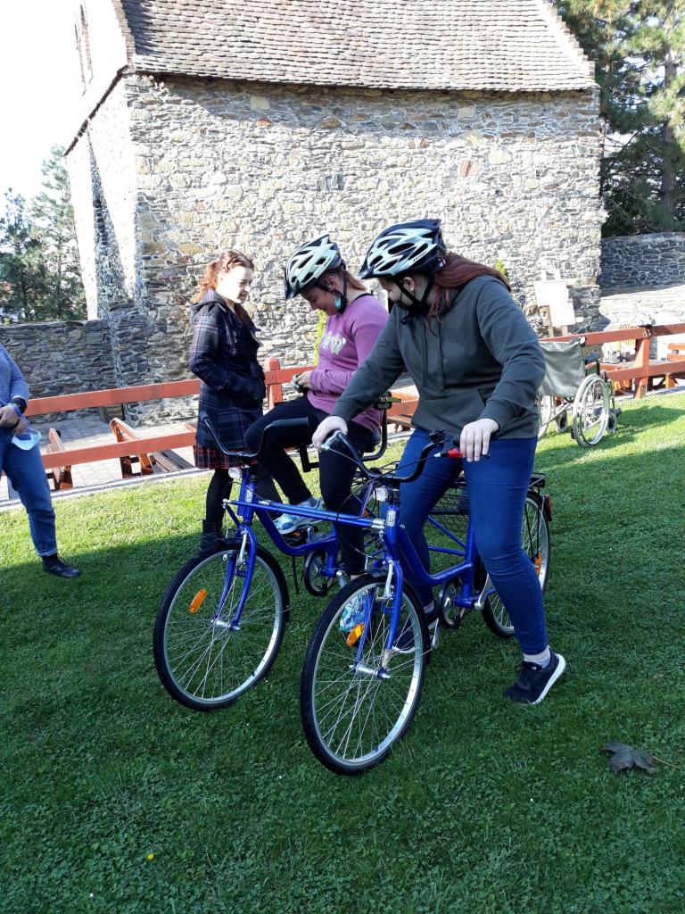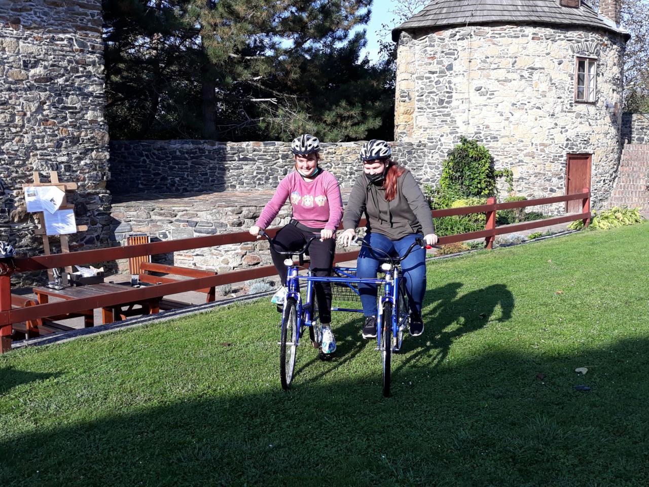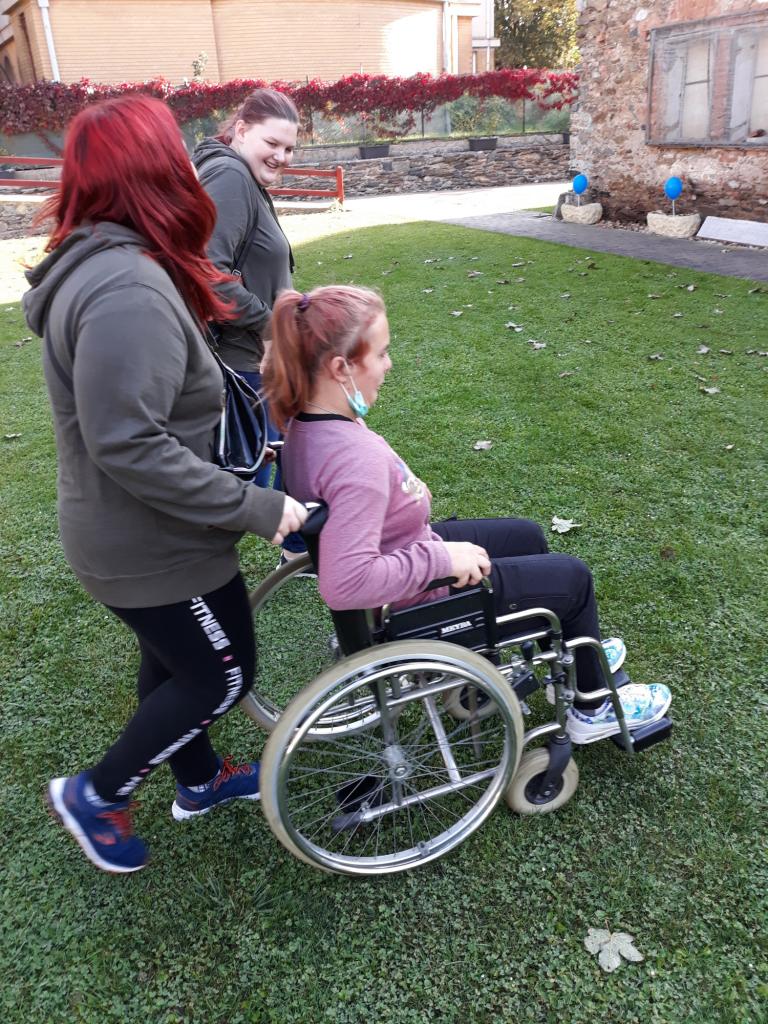 Venku na zahradě si dívky mohly vyzkoušet ovládání invalidního vozíku, projet se na speciálním tandemovém kole, projít přes balanční stezku a složit díly do bedny (to se nám nepovedlo). Na závěr jsme si vyzkoušely lis na odznaky a vyrobily si vlastní placku s logem 30. výročí Diakonie v Čáslavi.