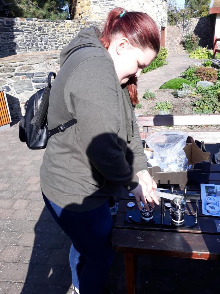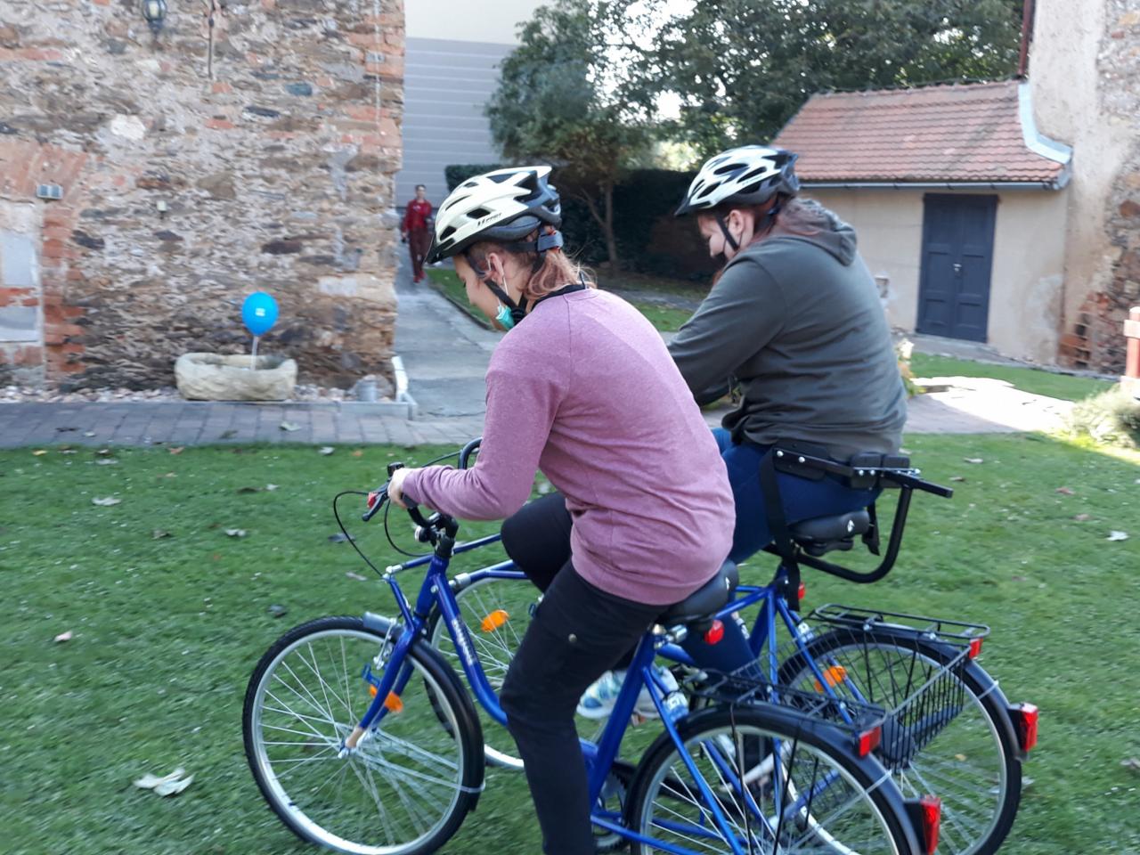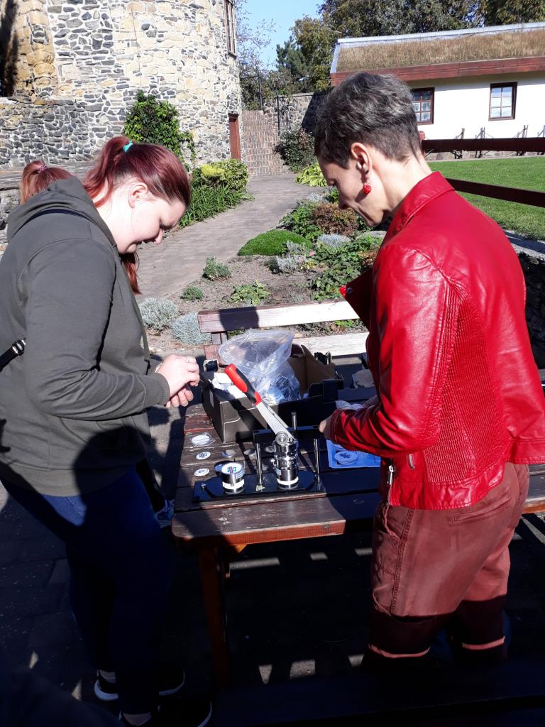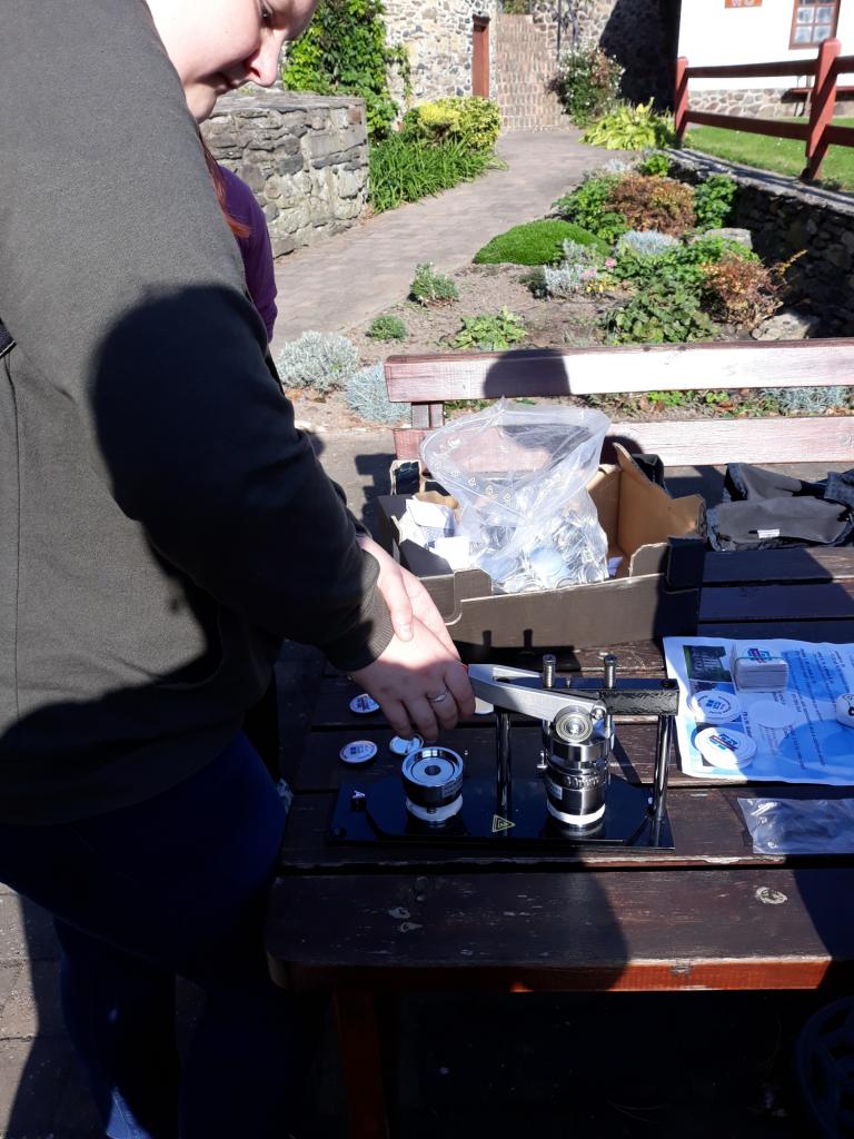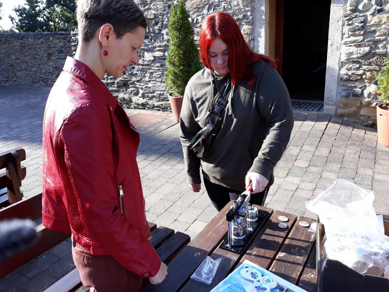 Venku na zahradě si dívky mohly vyzkoušet ovládání invalidního vozíku, projet se na speciálním tandemovém kole, projít přes balanční stezku a složit díly do bedny (to se nám nepovedlo). Na závěr jsme si vyzkoušely lis na odznaky a vyrobily si vlastní placku s logem 30. výročí Diakonie v Čáslavi.