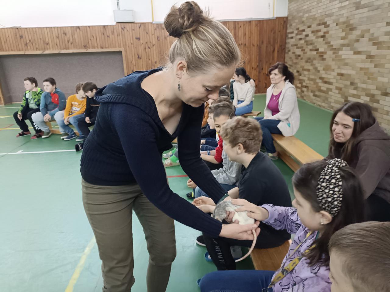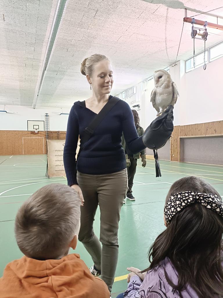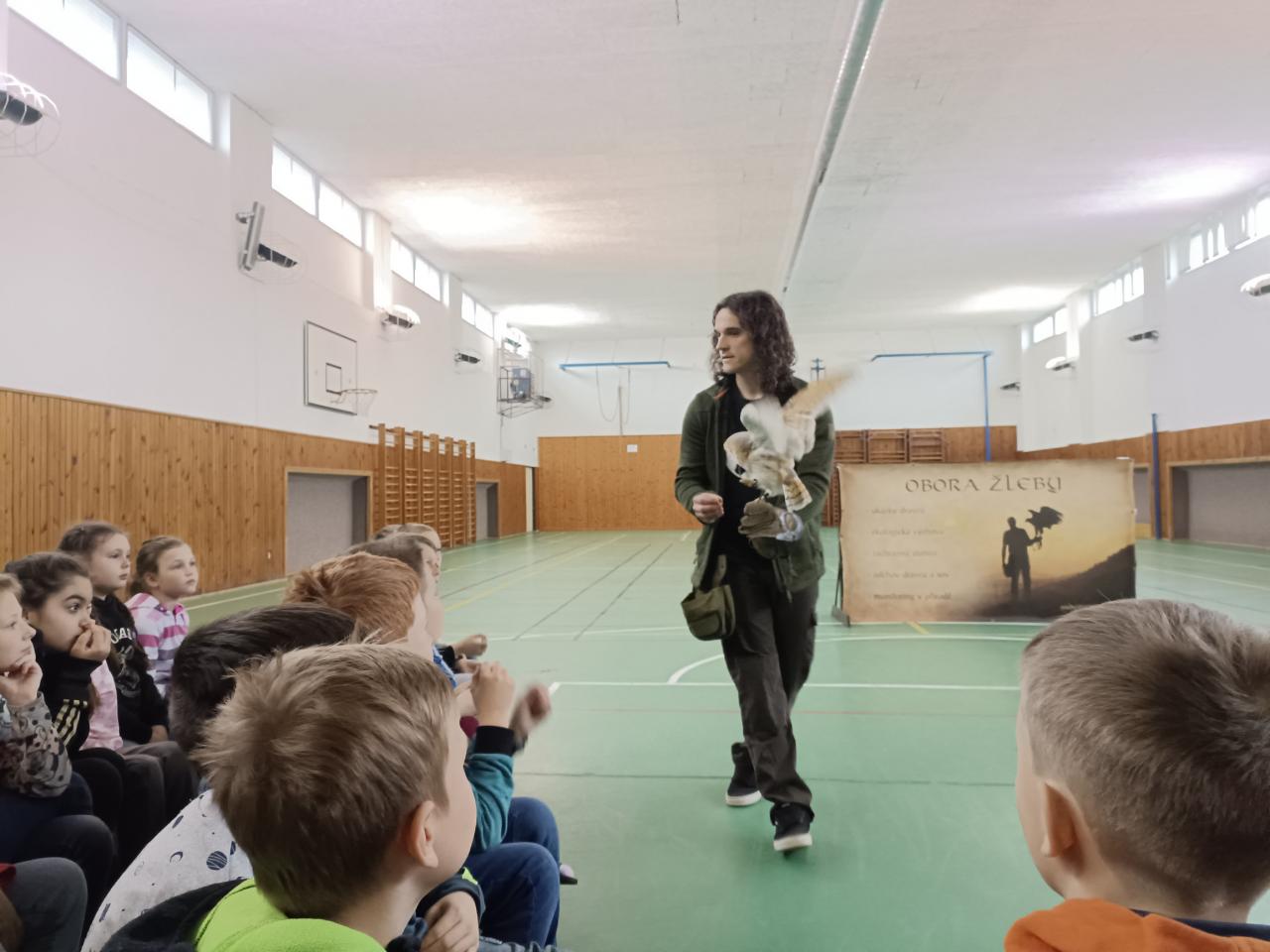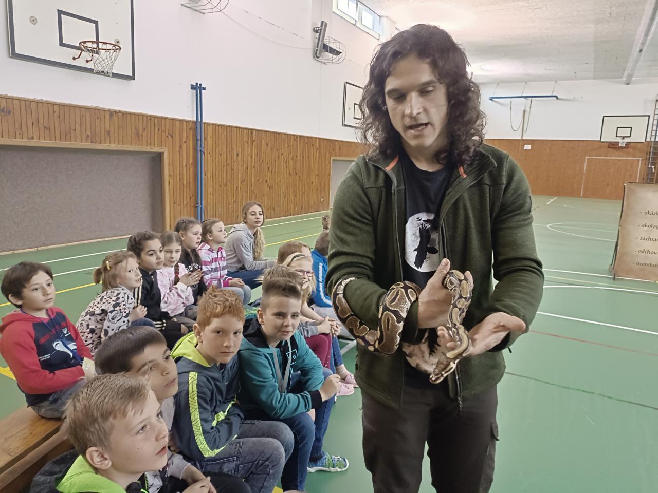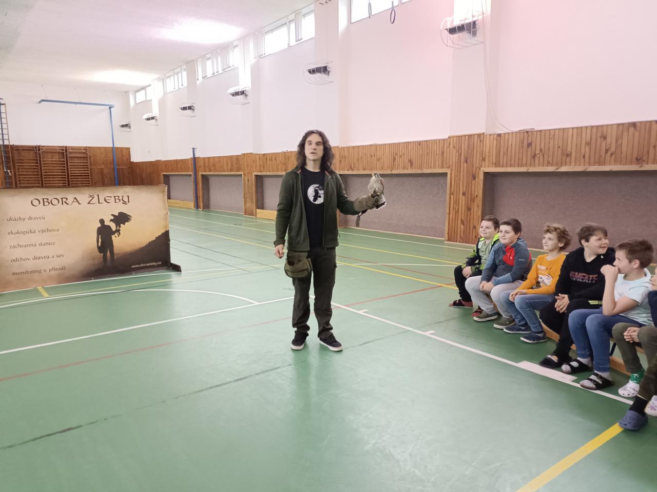 24.4. se žáci prvního stupně zúčastnili výukového programu "Smysly zvířat", který se uskutečnil ve školí tělocvičně pod vedením zaměstnanců Obory Žleby. Žáci se dozvěděli mnoho zajímavého o smyslech zvířat, která si mohli prohlédnout i pohladit. Viděli např. ježka, potkana nebo netopýra, sledovali neslyšný let dravců a sov, vytvořili překážkovou dráhu ze svých rukou pro šváby a ti nejodvážnější se mohli pomazlit s krajtou.