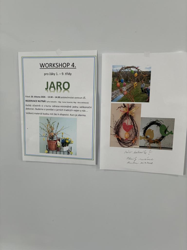 Dnes se na naší škole konal jarní workshop, který byl věnován přicházejícímu jaru a velikonočním tradicím. Žáci se aktivně zapojili do tvoření krásných velikonočních dekorací – vyráběli například ozdoby, zápichy a jarní aranžmá.
