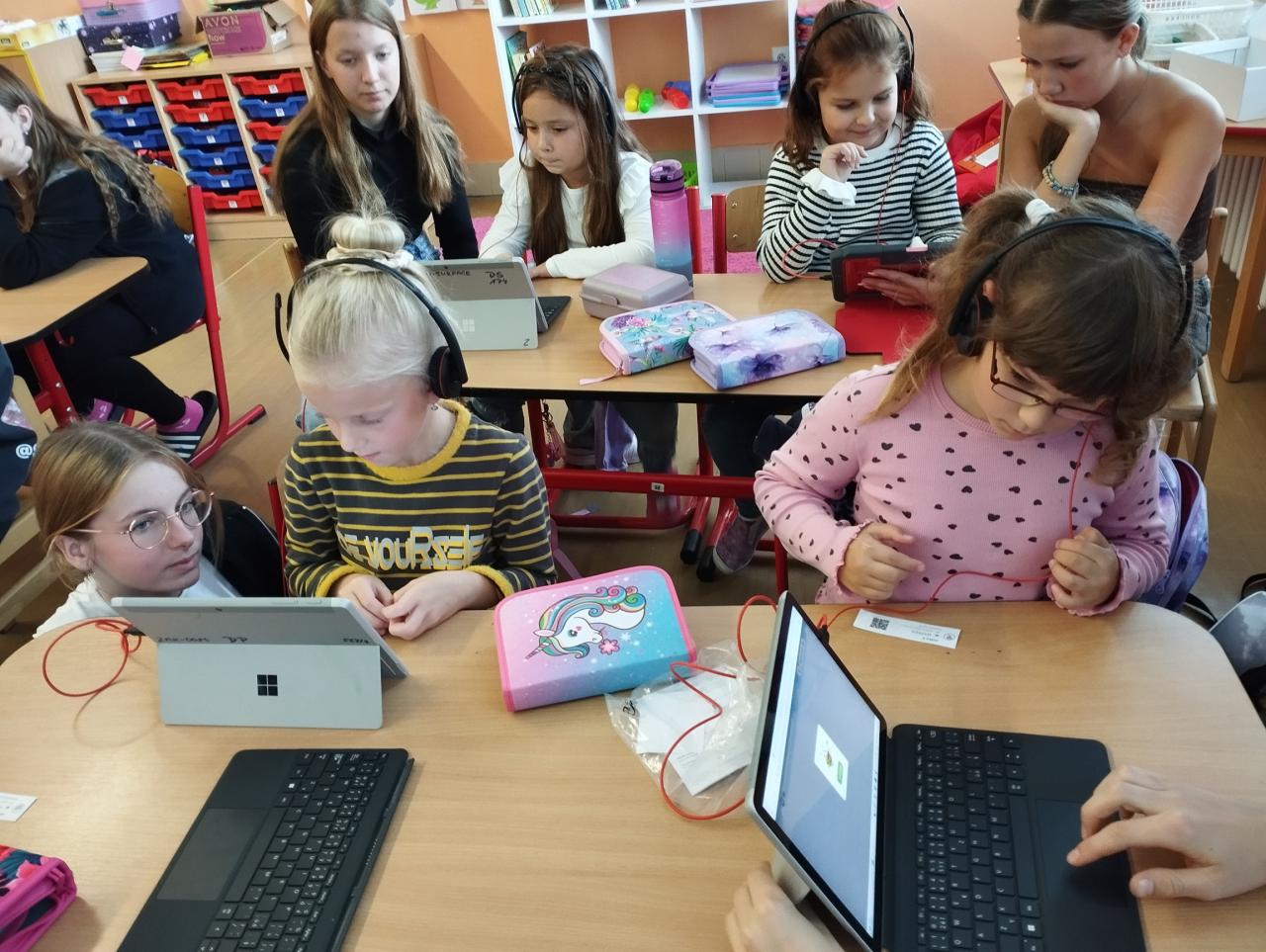 První setkání s aplikací Včelka nás zavedlo do prostředí zajímavých úkolů. Vyzkoušeli jsme si svůj postřeh, důvtip a řešili různě obtížné úlohy. S přihlášením do aplikace nám pomáhali deváťáci.