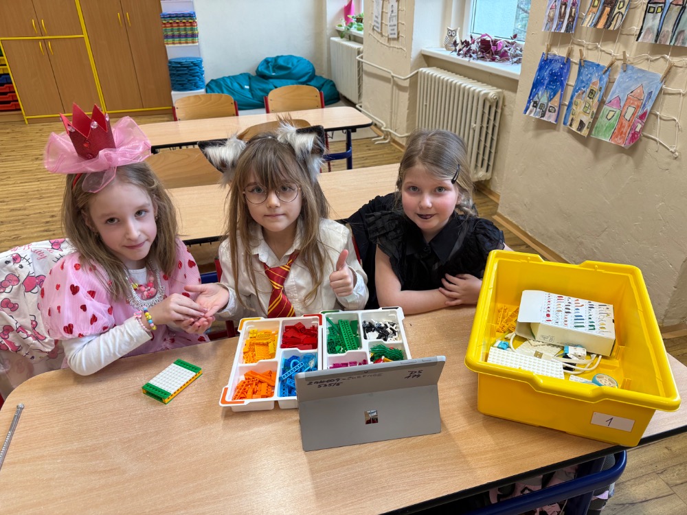 Ve středu před jarními prázdninami jsme si udělali karneval. Celý den jsme se učili v kostýmech, které jsme si hned ráno představili. Setkali jsme se i s 1.B v tělocvičně, kde jsme si zahráli zábavné hry. Završením skvělého dne byly stavebnice Lego Education s paní učitelkou Mgr. Janou Peck.