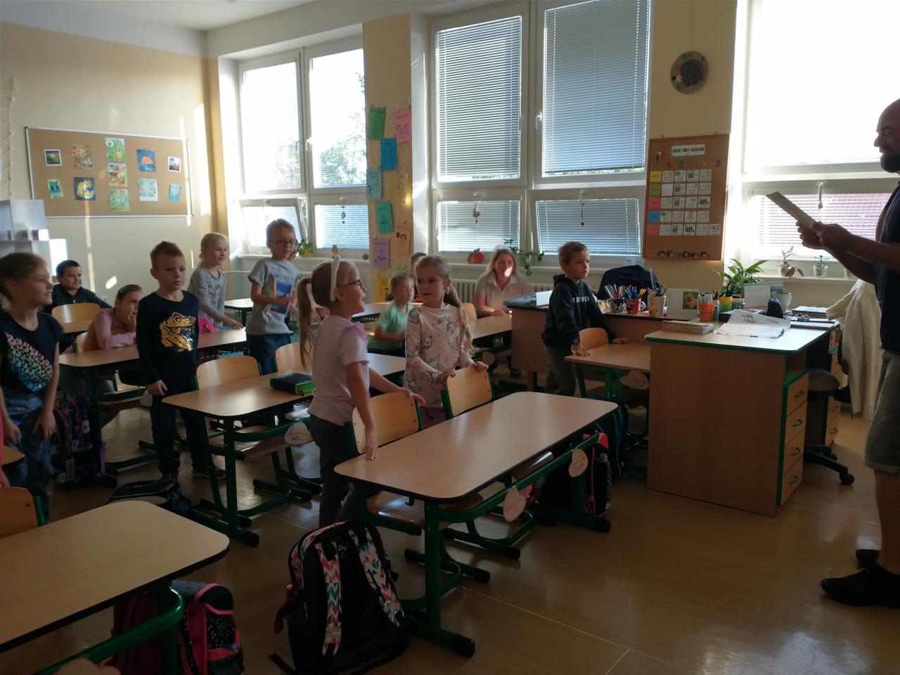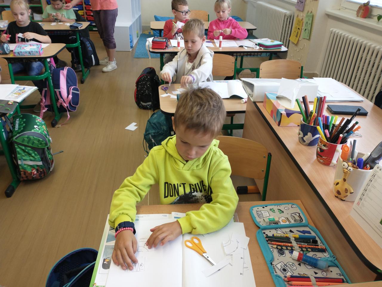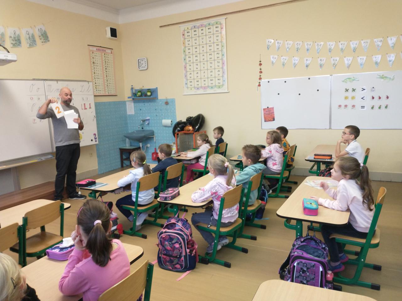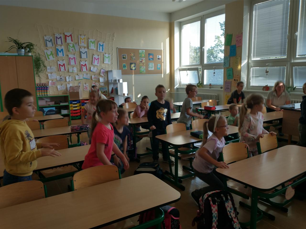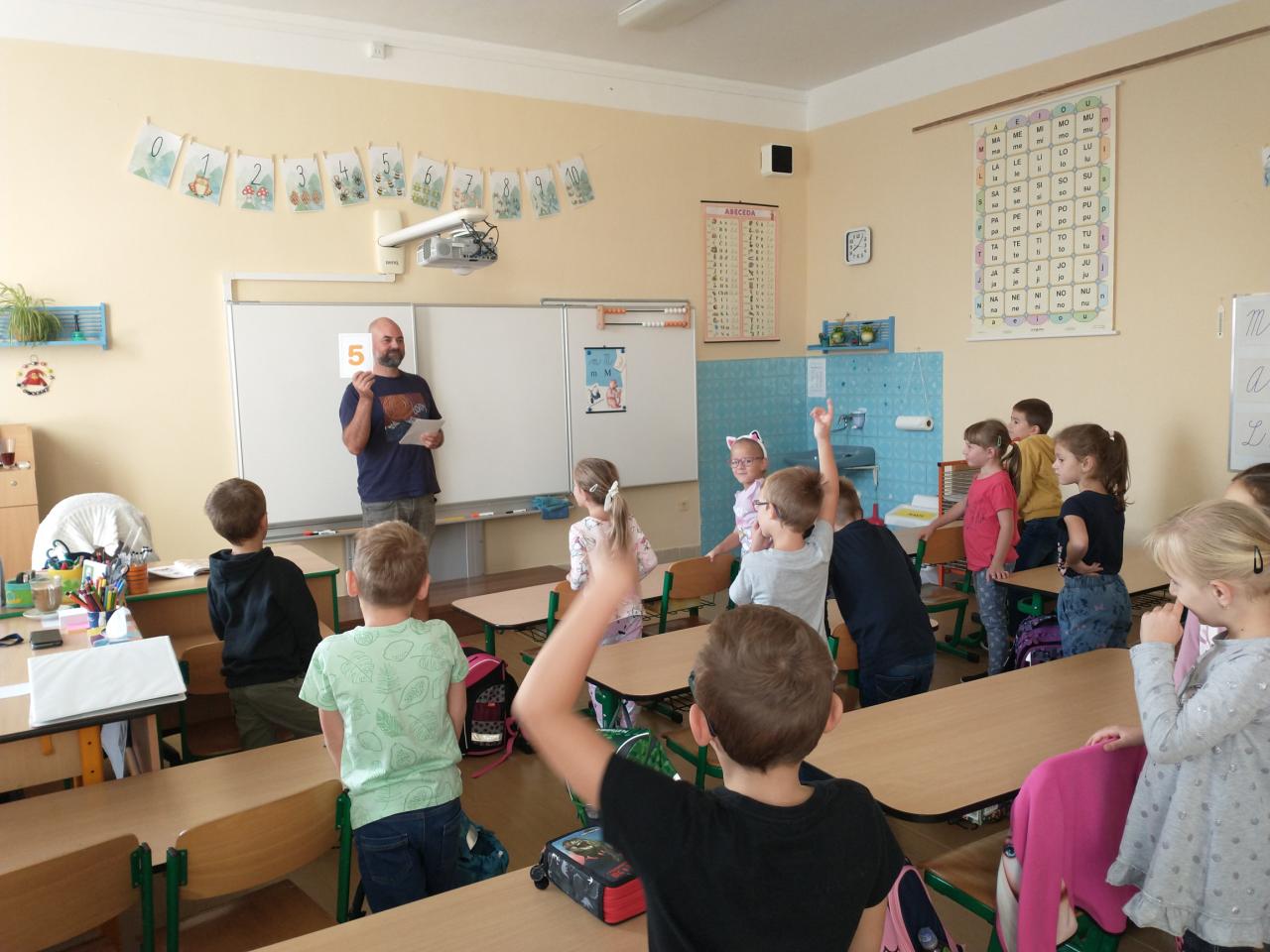 Od září se učíme anglický jazyk. Pracujeme s kartami, plníme obrázkové úkoly. Velkým zpestřením výuky jsou pro nás hodiny s rodilým mluvčím. Zvládli jsme s ním i naši oblíbenou matematickou rozcvičku - samozřejmě celou anglicky!