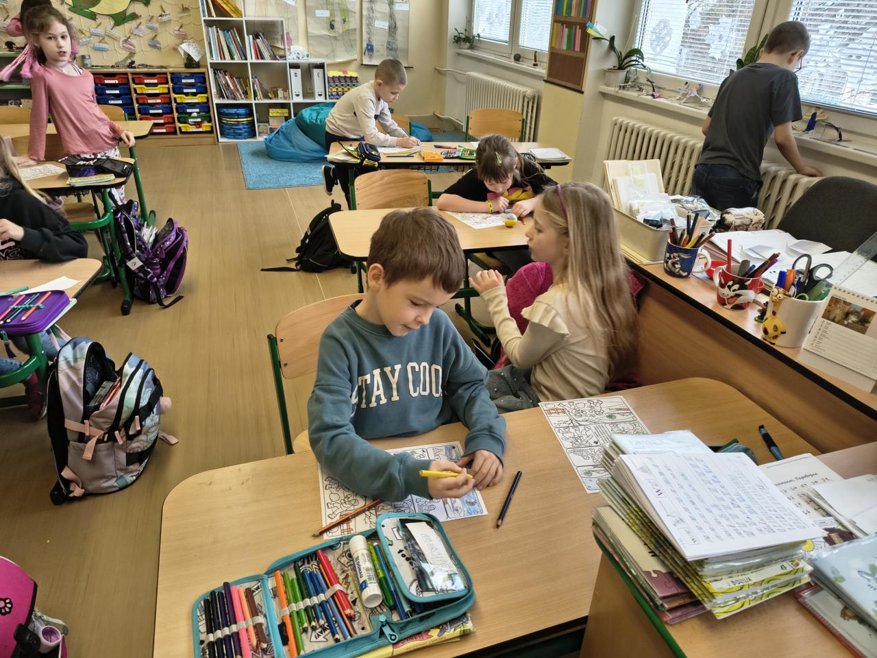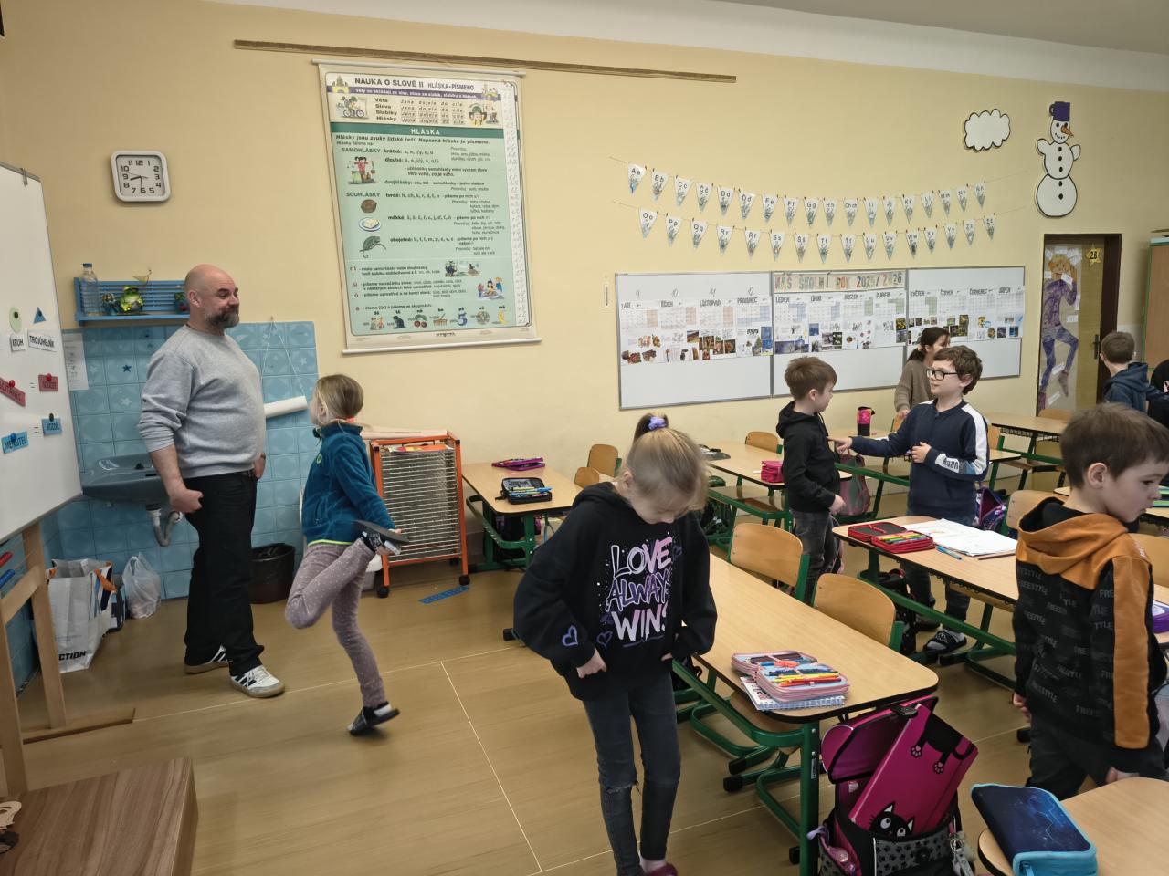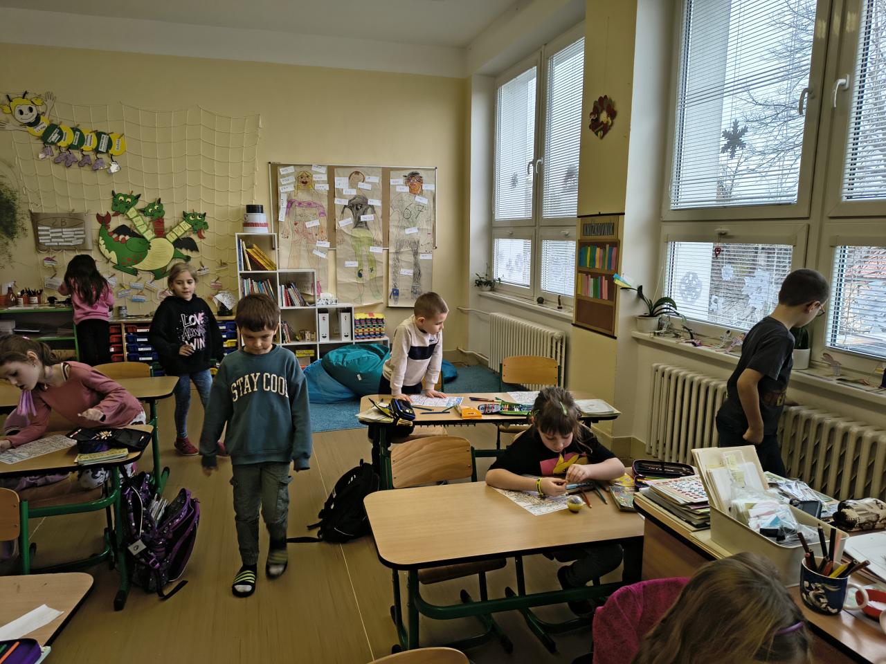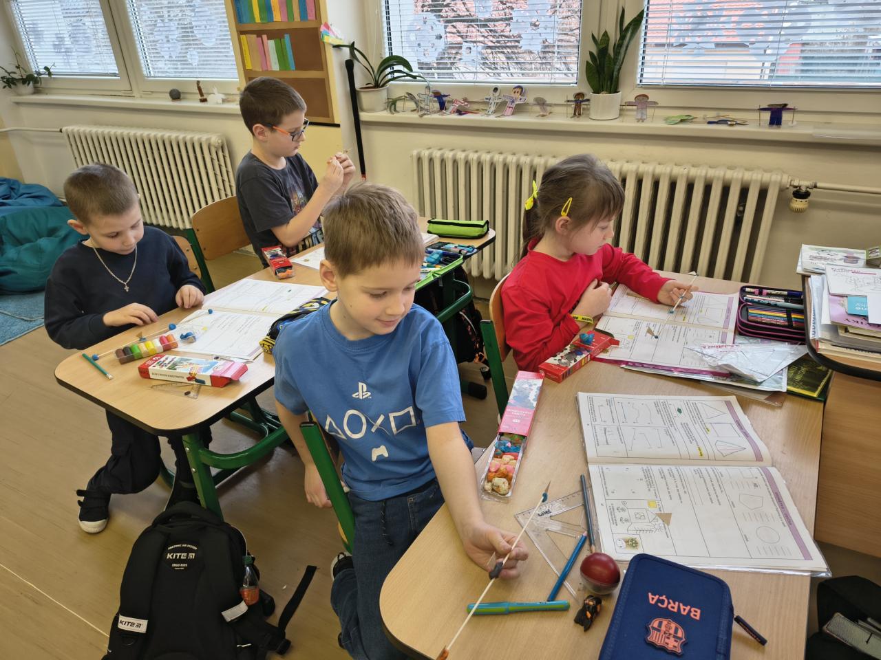 Naučili jsme se, co je to přímka, povedly se nám krásné rýsované obrázky. Určovali jsme tvrdé a měkké souhlásky. Protáhli jsme se při angličtině s rodilým mluvčím. Užili jsme si hry Zahradník a Hledej, najdi, vybarvi. Tématem prvouky bylo zdravé stravování a samozřejmě masopust.