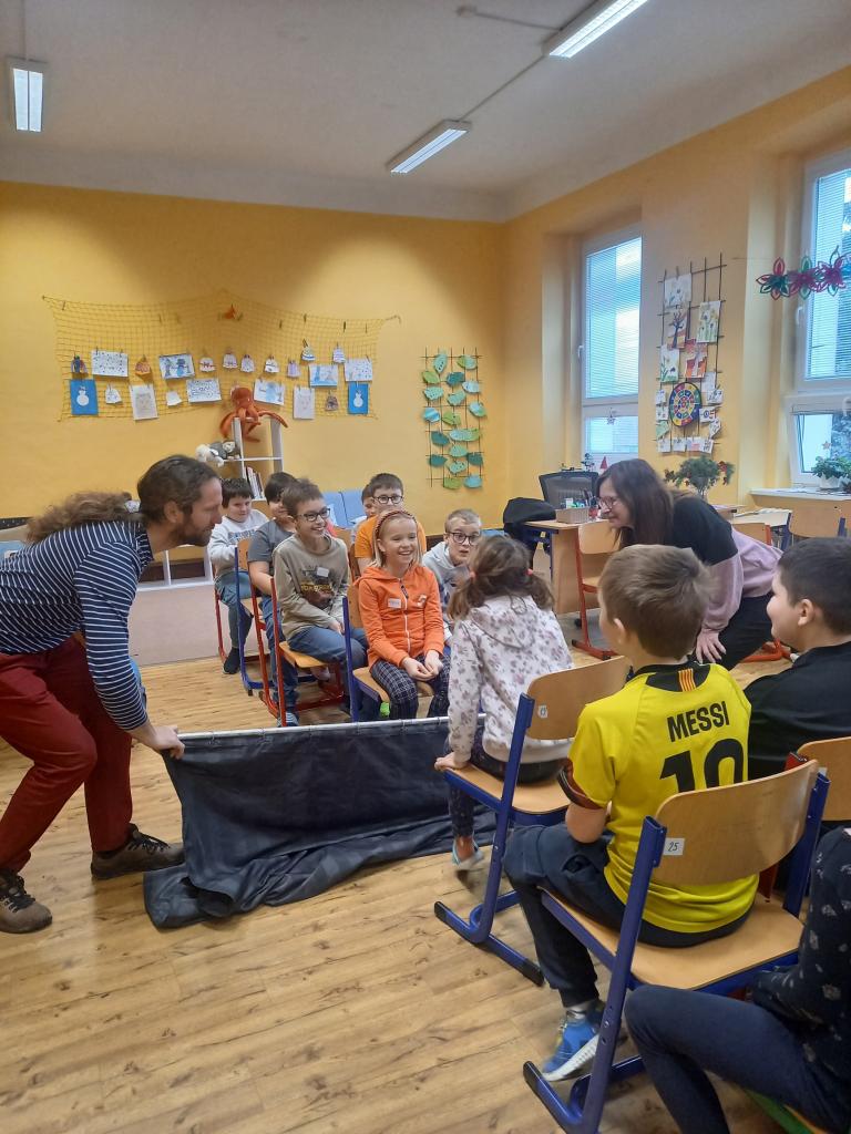 ...nás opět navštívil pan Převrátil, abychom si pod jeho vedením zahráli další hry a také upevnili své vztahy na základě dodržování pravidel. Dokázali jsme se zcela potichu přemisťovat a vytvářet skupiny, měli jsme radost z nové hry Autobus a velká legrace byla při rozpoznávání hlasu spolužáka či spolužačky při zavázaných očích. Na závěr nás zaujala rytmická hra Déšť. Víme, že pro klidnou a pečlivou práci je opravdu třeba pravidla dodržovat.