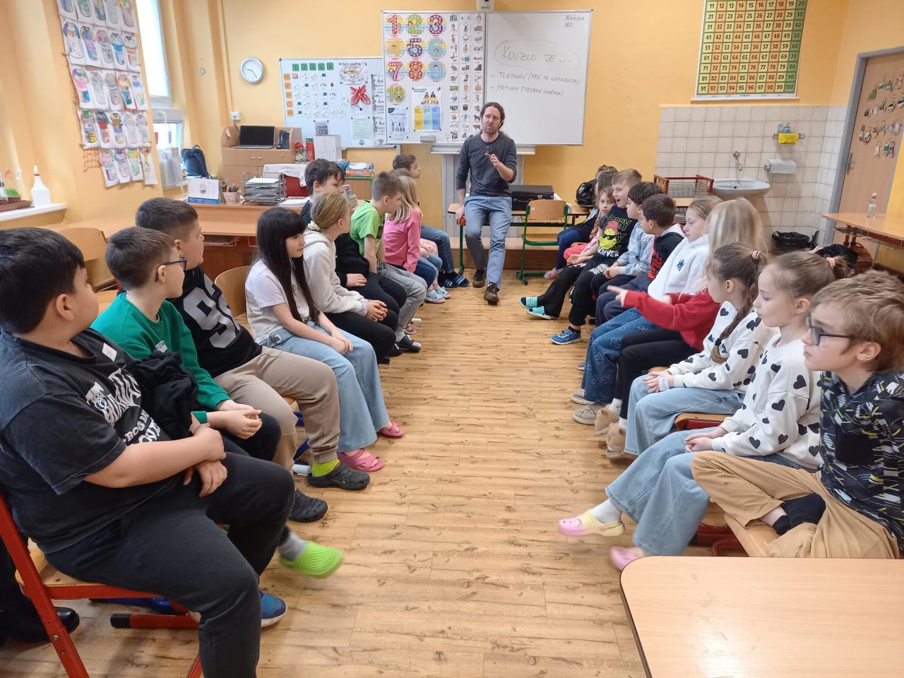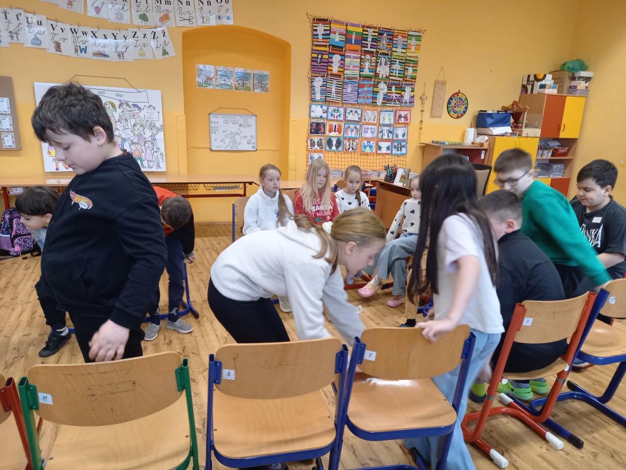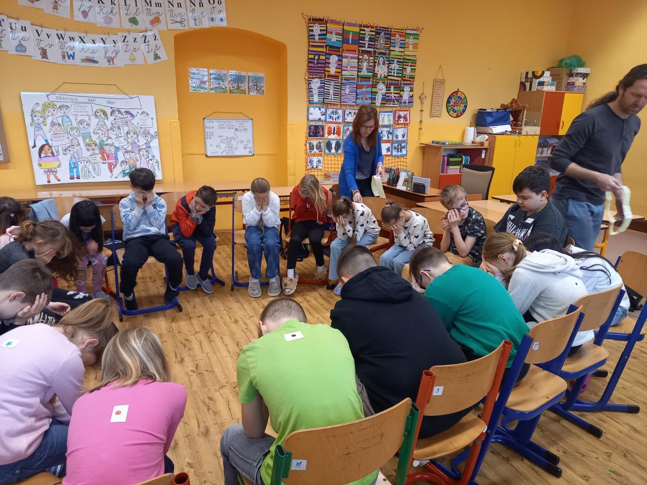 ...proběhlo třetí setkání s panem Převrátilem, pod jehož vedením jsme se snažili zlepšit své vzájemné vztahy za dodržování dohodnutých pravidel. Prostřednictvím rozličných her jsme zjistili, v čem dokážeme být dobří a v čem naopak potřebujeme pomoci. Připomněli jsme si aktivity z minulých setkání, navázali na začátek věty "Kouzlo je..." a bez jediného slova se roztřídili do pěti skupin. Než jsme si zahráli poslední hru, fotbálek vsedě, hodně jsme debatovali o situaci ve třídě. Je určitě dobře, že si uvědomujeme, jaké chyby děláme, a jak je můžeme napravit. Teď už je jen na nás, zda jsme ochotní nabyté informace využít, pravidla dodržovat, a tak pracovat na zlepšení atmosféry ve třídě.
