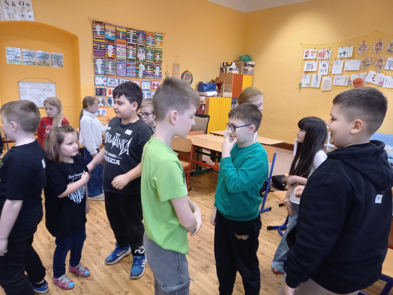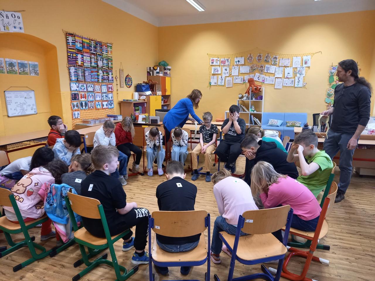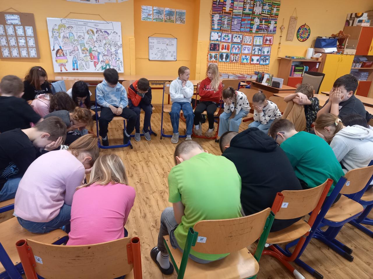 ...proběhlo třetí setkání s panem Převrátilem, pod jehož vedením jsme se snažili zlepšit své vzájemné vztahy za dodržování dohodnutých pravidel. Prostřednictvím rozličných her jsme zjistili, v čem dokážeme být dobří a v čem naopak potřebujeme pomoci. Připomněli jsme si aktivity z minulých setkání, navázali na začátek věty "Kouzlo je..." a bez jediného slova se roztřídili do pěti skupin. Než jsme si zahráli poslední hru, fotbálek vsedě, hodně jsme debatovali o situaci ve třídě. Je určitě dobře, že si uvědomujeme, jaké chyby děláme, a jak je můžeme napravit. Teď už je jen na nás, zda jsme ochotní nabyté informace využít, pravidla dodržovat, a tak pracovat na zlepšení atmosféry ve třídě.