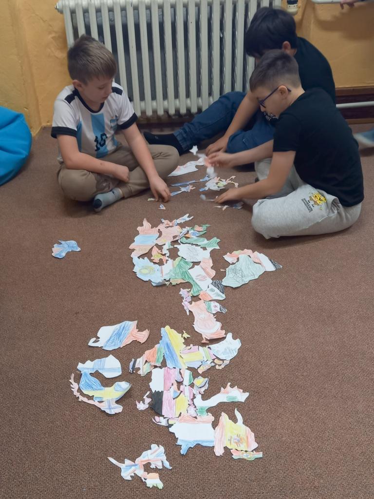...jsme ve třídě zažili překvapení v podobě zajímavé práce spolužáka Bohdana. Už delší dobu se někteří bavíme vlajkami zemí celého světa a prostřednictvím kartiček se vzájemně "zkoušíme. Jaké překvapení, když "Bóďa"v pondělí vysypal na lavici papírové tvary mnoha zemí v barvách vlajek. Hned jsme se pustili do sestavování mapy těchto zemí. Dokonce padla i domluva, že budeme pokračovat...