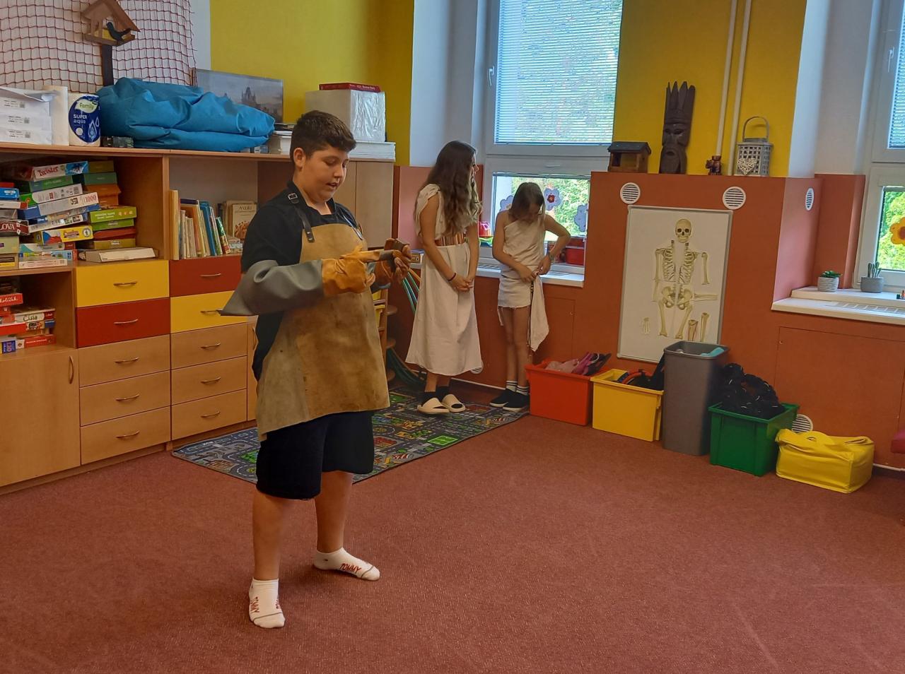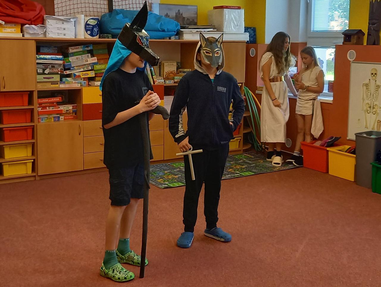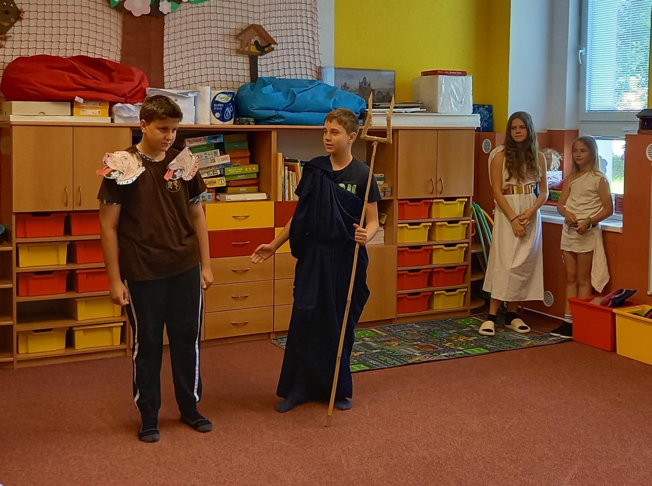 ...nás žáci 6.A pozvali na malou procházku s bohy starověkých národů. Společně s 1.A jsme si vyslechli povídání, otázky a odpovědi jednotlivých bohů i jejich průvodkyň. Kromě informací měli pro nás nachystanou hru - skládání obrázku. Po zapojení společných sil a poskládání (téměř celého) obrázku jsme si zasloužili sladkou odměnu. Procházka s šesťáky byla moc pěkná a natolik zajímavá, že jsme si i ve třídě jestě dohledali další obrázky, fotky a informace.