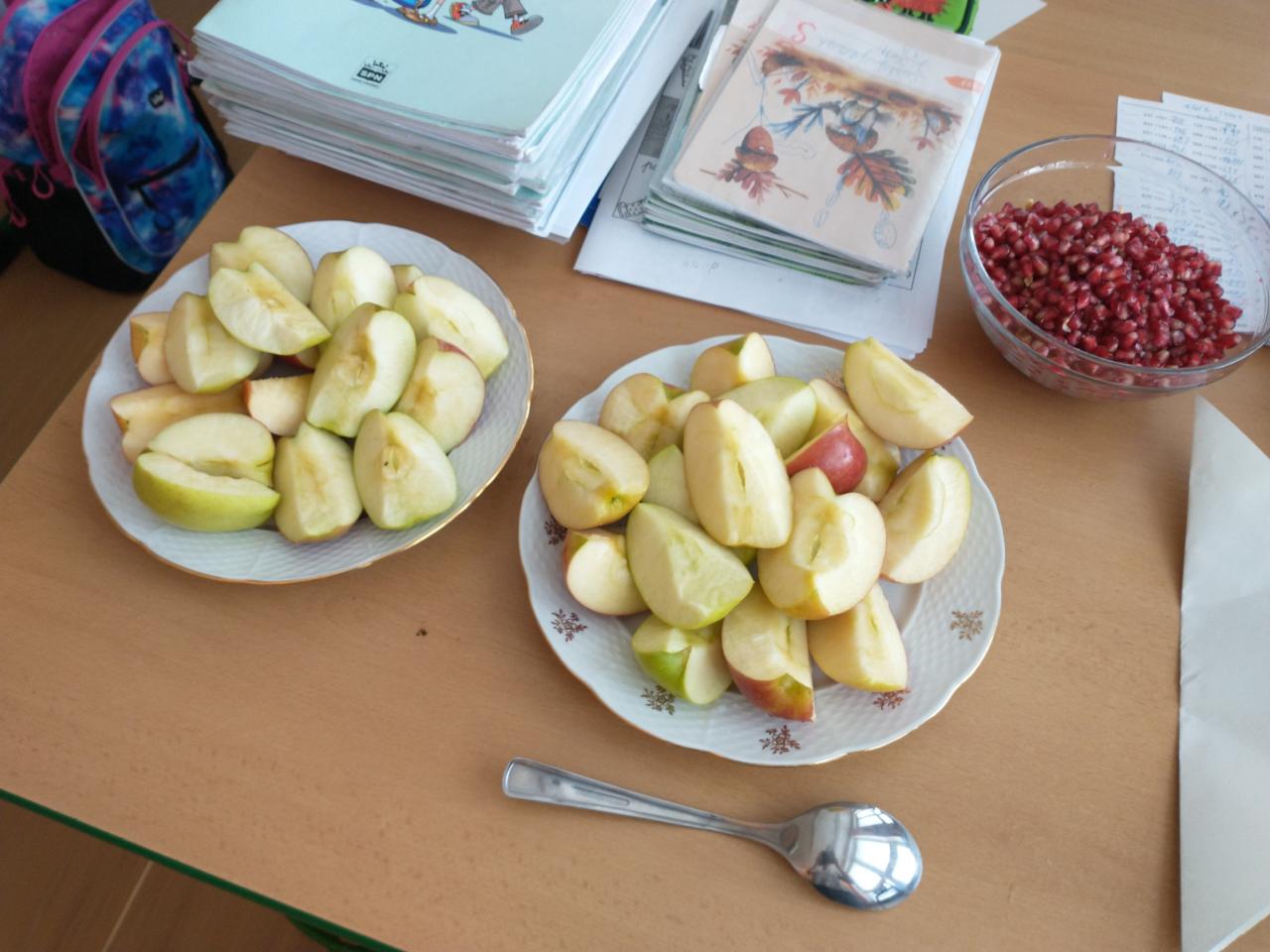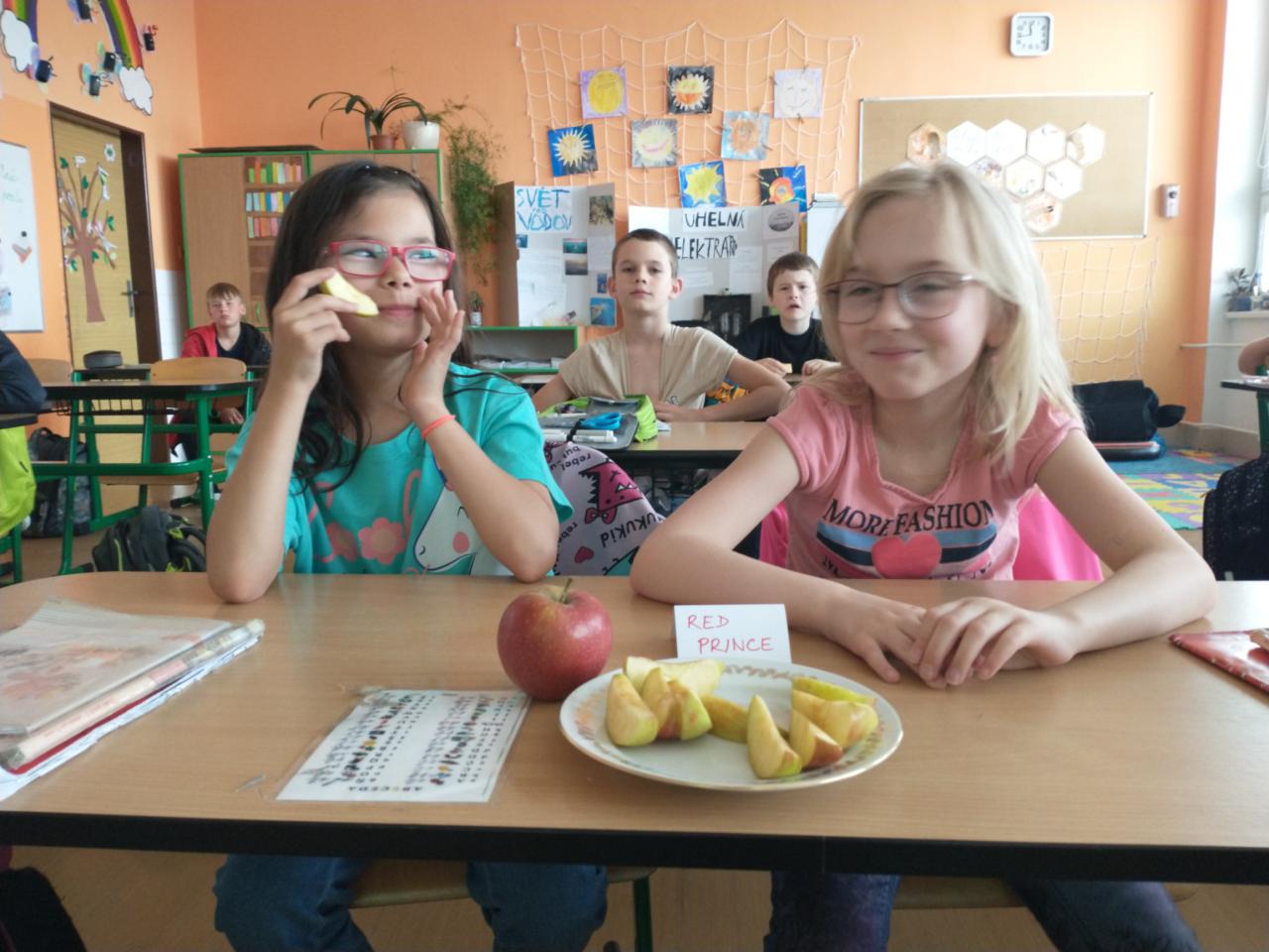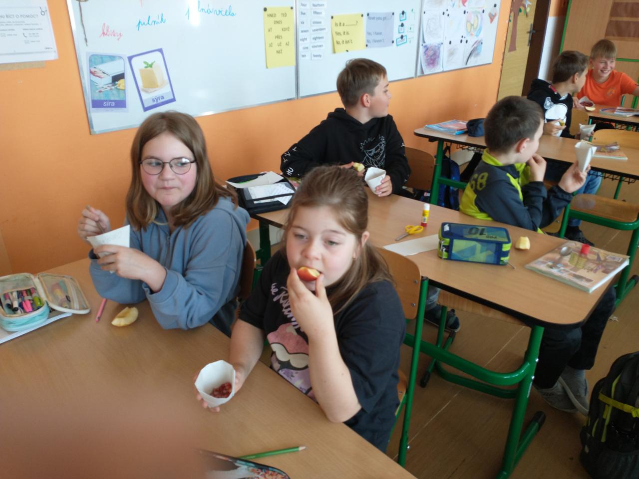 Letošní ochutnávku ovoce jsme propojili s výtvarnou výchovou. Na semínka granátového jablka jsme si složili kelímek. Zhodnotili jsme, který druh jablka získává v naší třídě nejvíc hlasů. A nakonec jsme si tu ovocnou dobrotu namalovali. Školní projekt Ovoce, mléko a zelenina do škol s Bovýskem-mňam.