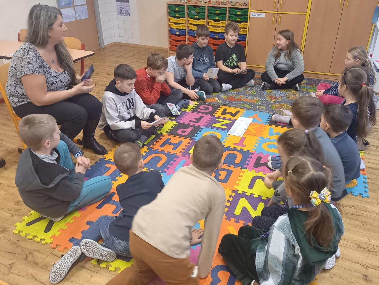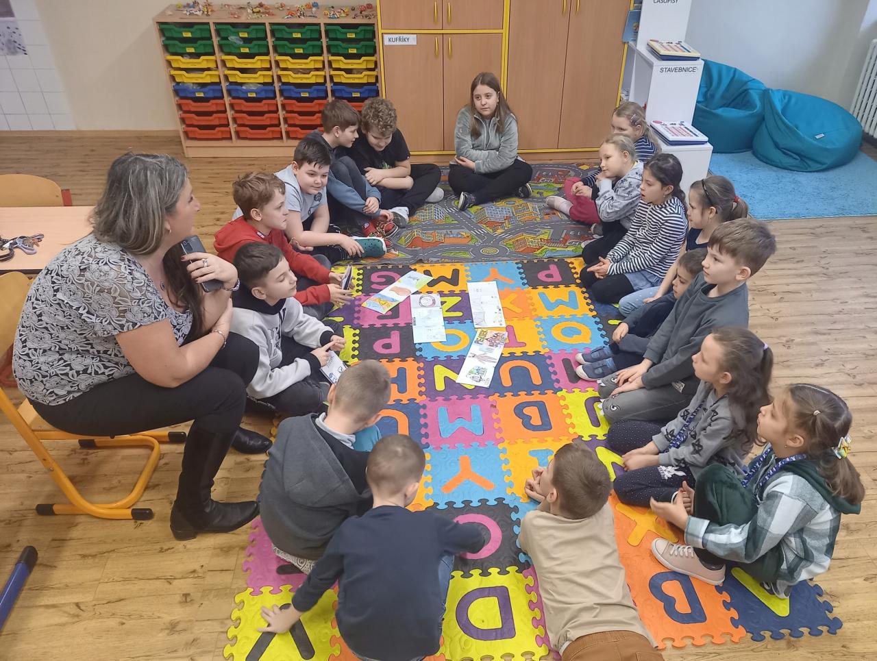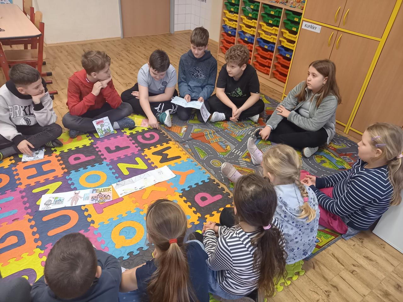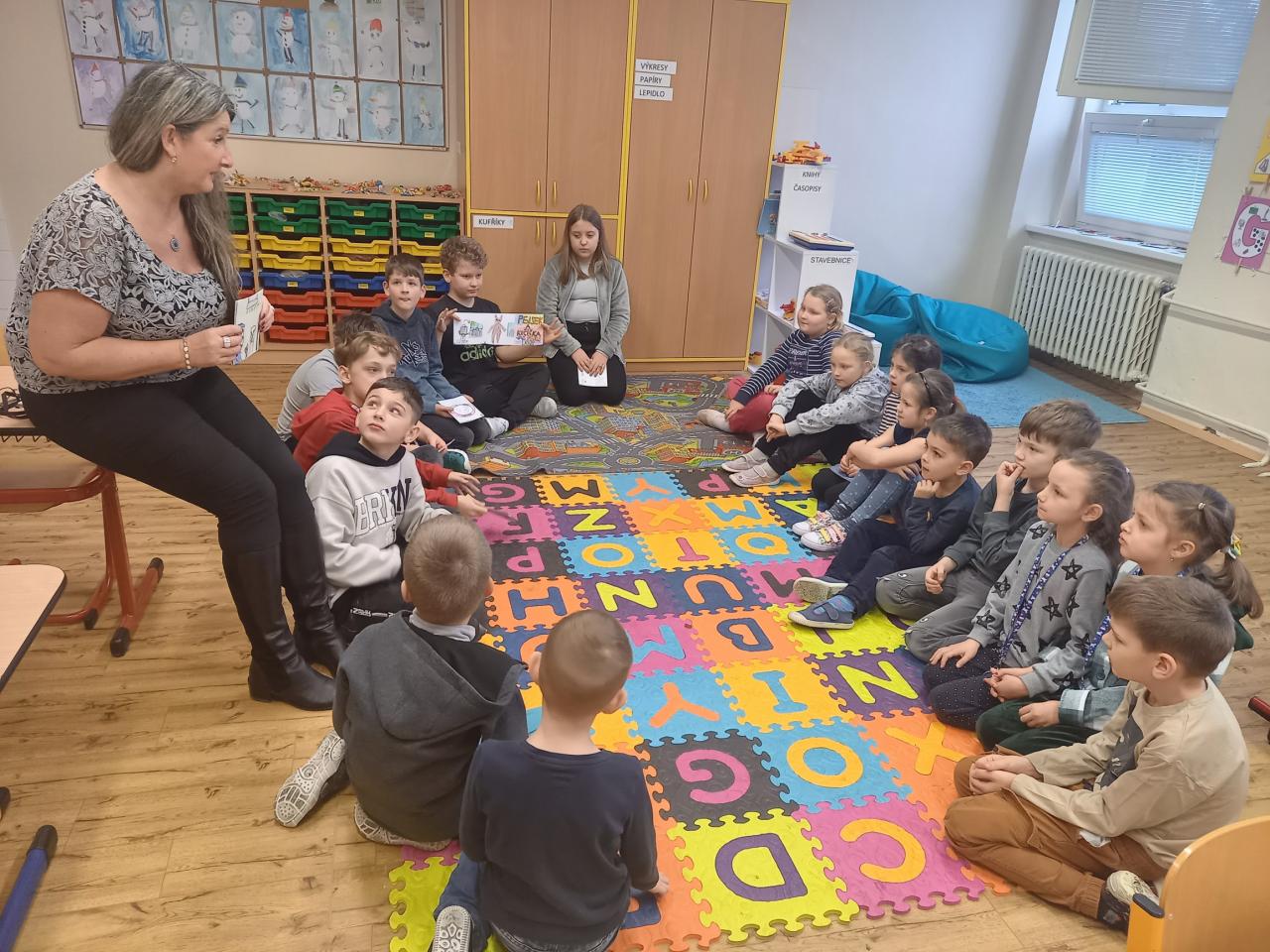 ...nás po předchozí domluvě navštívili žáci 5.B třídy, kteří se s námi chtěli podělit o radost z vytvořeného leporela. Měli jsme možnost vyslechnout zajímavá pohádková vyprávění, která byla doprovázena ukázkami leporel s pěknými ilustracemi. Padly také dotazy a odpovědi nebo dokončení vyprávění. Aktivita se nám moc líbila, je pro nás inspirací. Moc děkujeme p. uč. Miláčkové a žákům, kteří nám chtěli své hezké práce prezentovat.