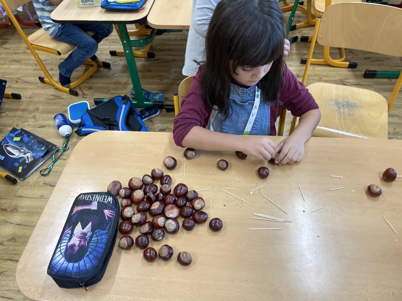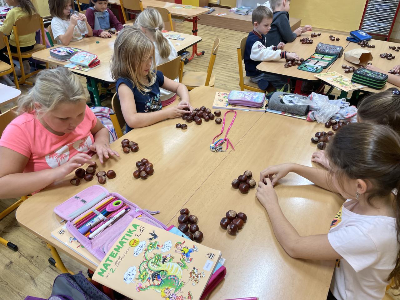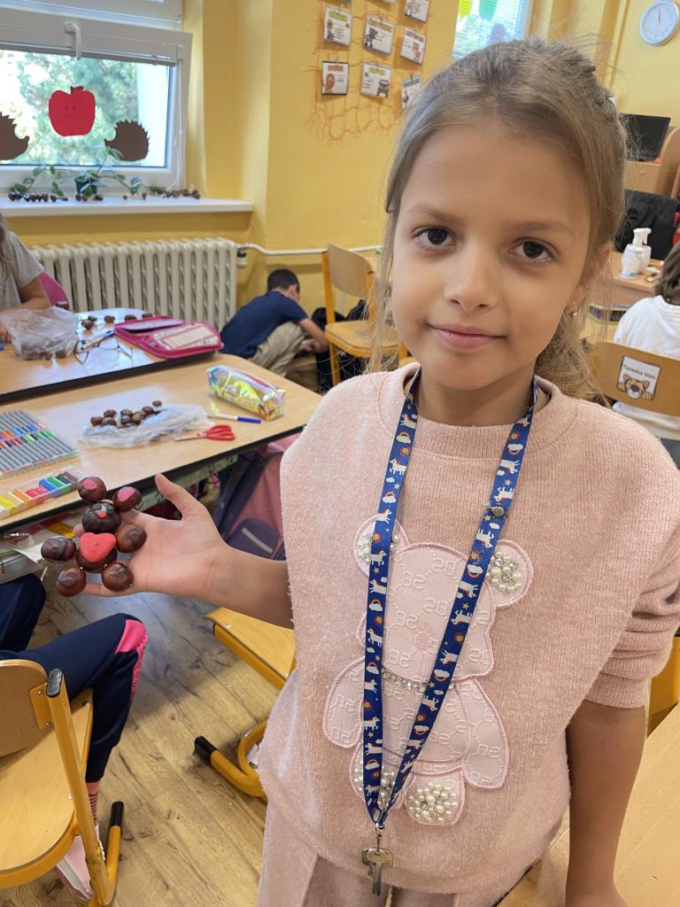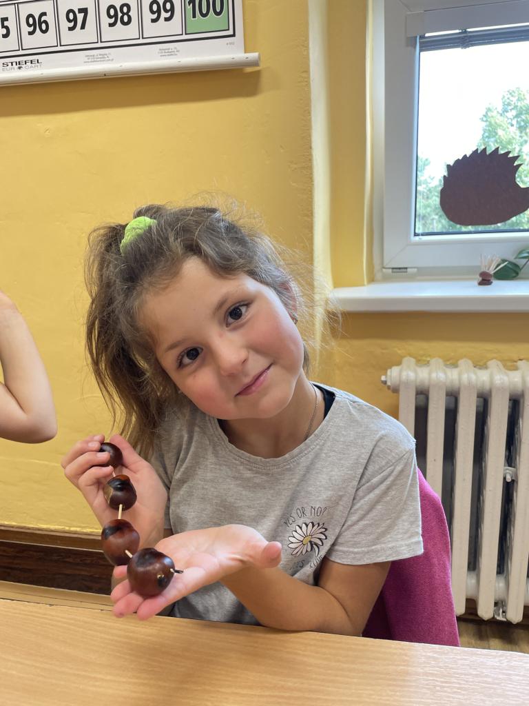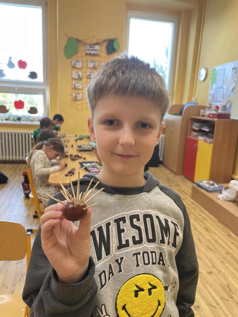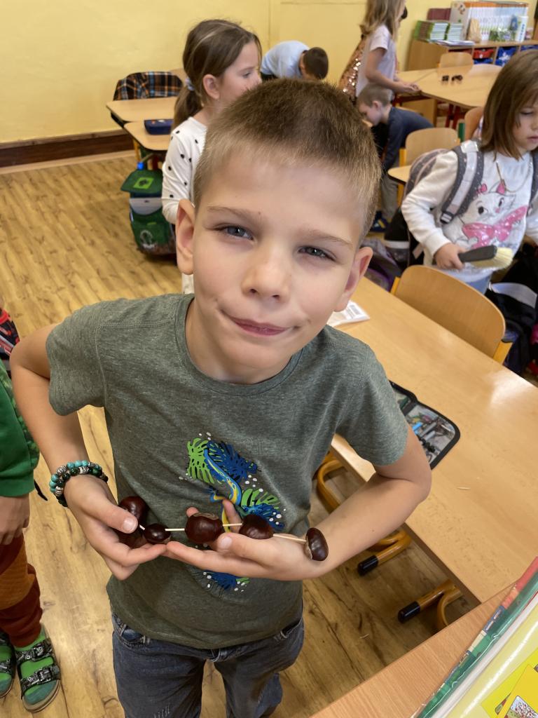 Podzim zavítal i do II.B, kde se žáci učili s různými podzimními přírodninami, zejména s kaštany.