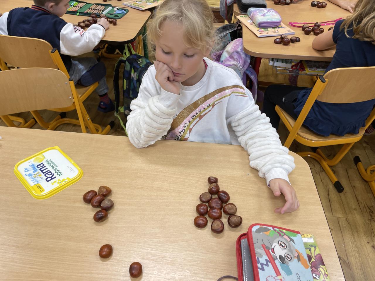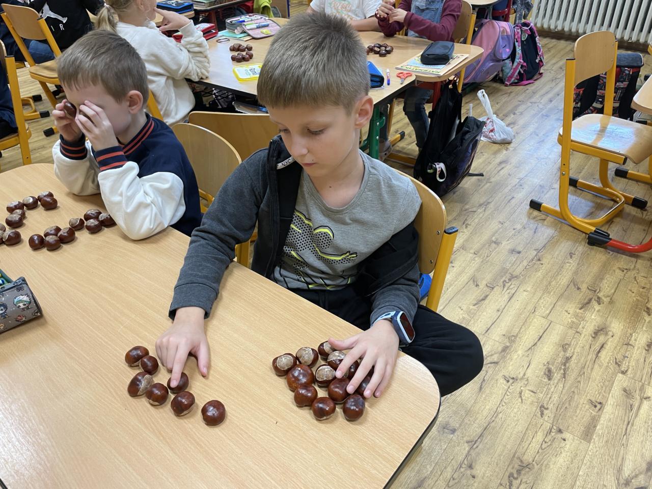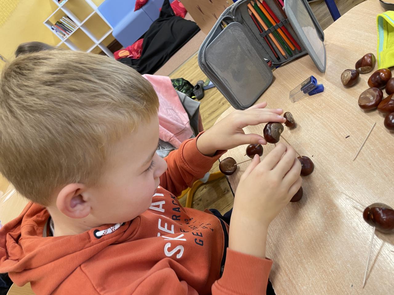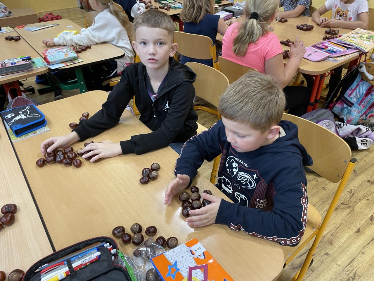 Podzim zavítal i do II.B, kde se žáci učili s různými podzimními přírodninami, zejména s kaštany.