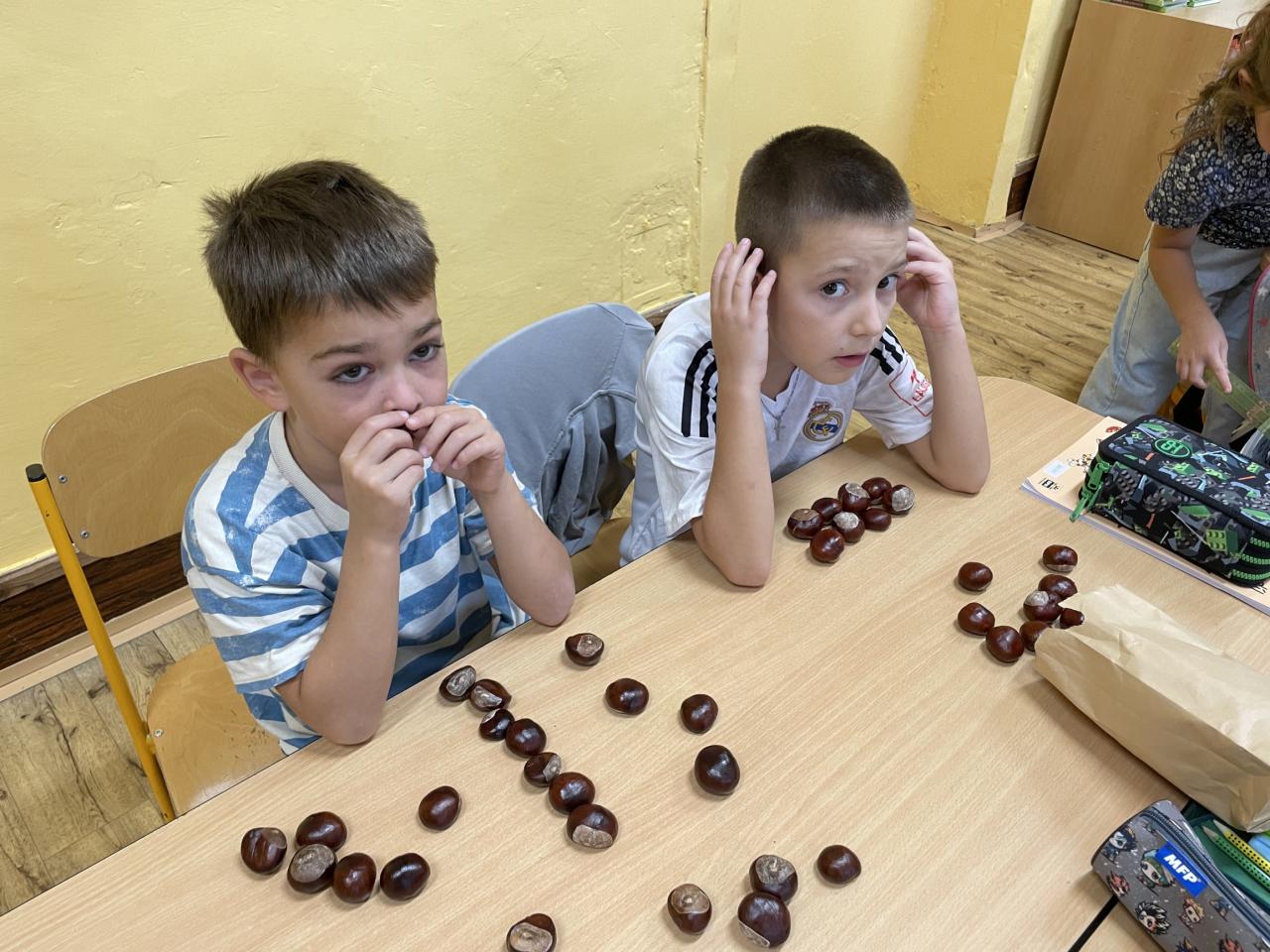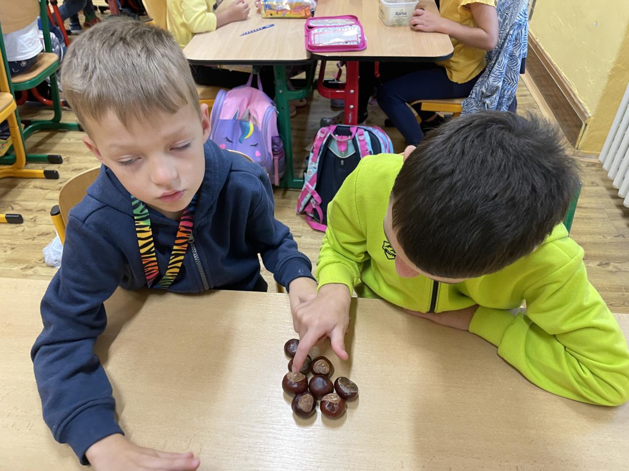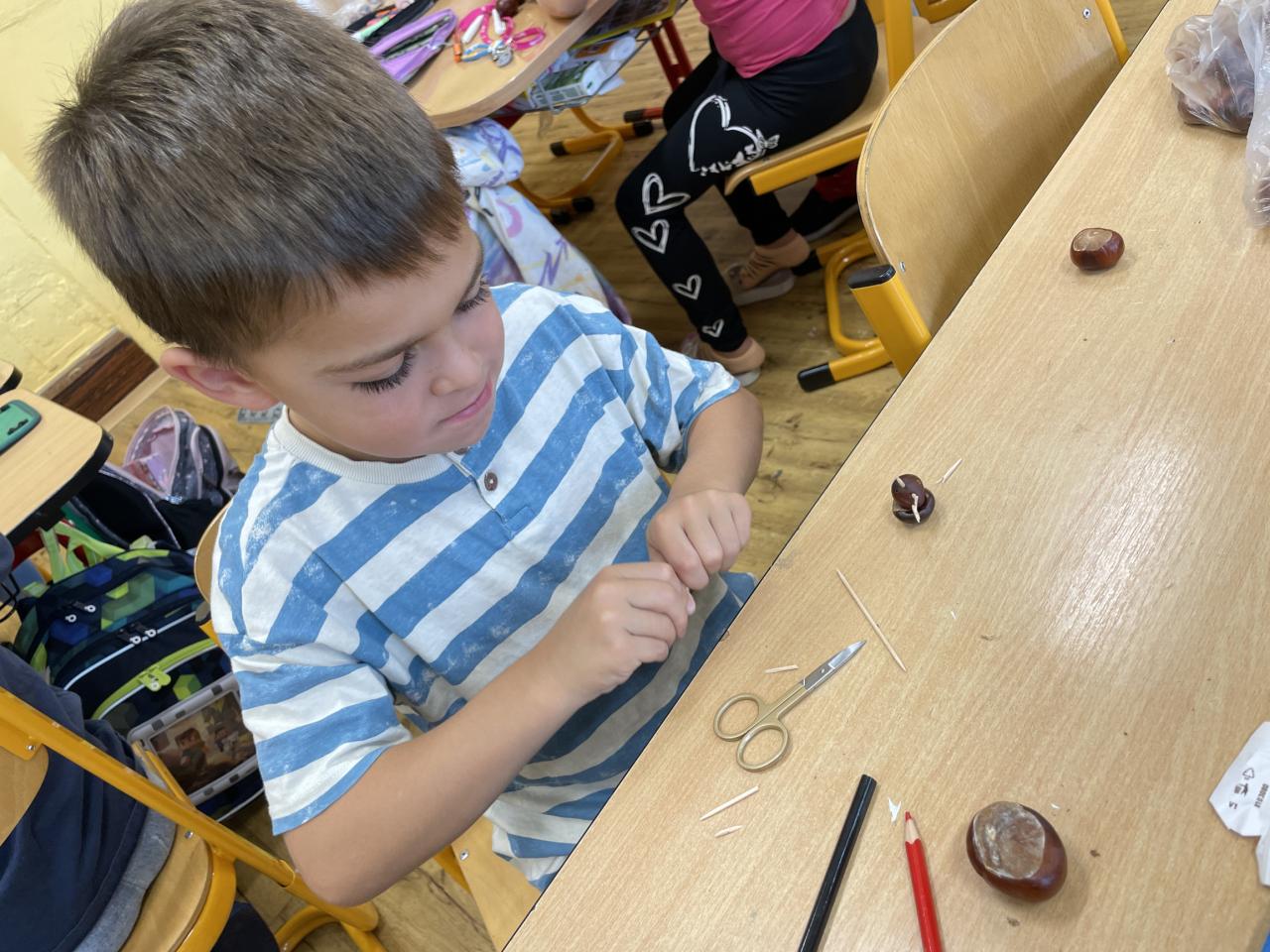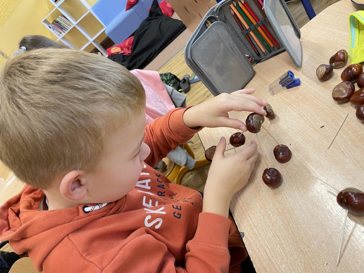 Podzim zavítal i do II.B, kde se žáci učili s různými podzimními přírodninami, zejména s kaštany.