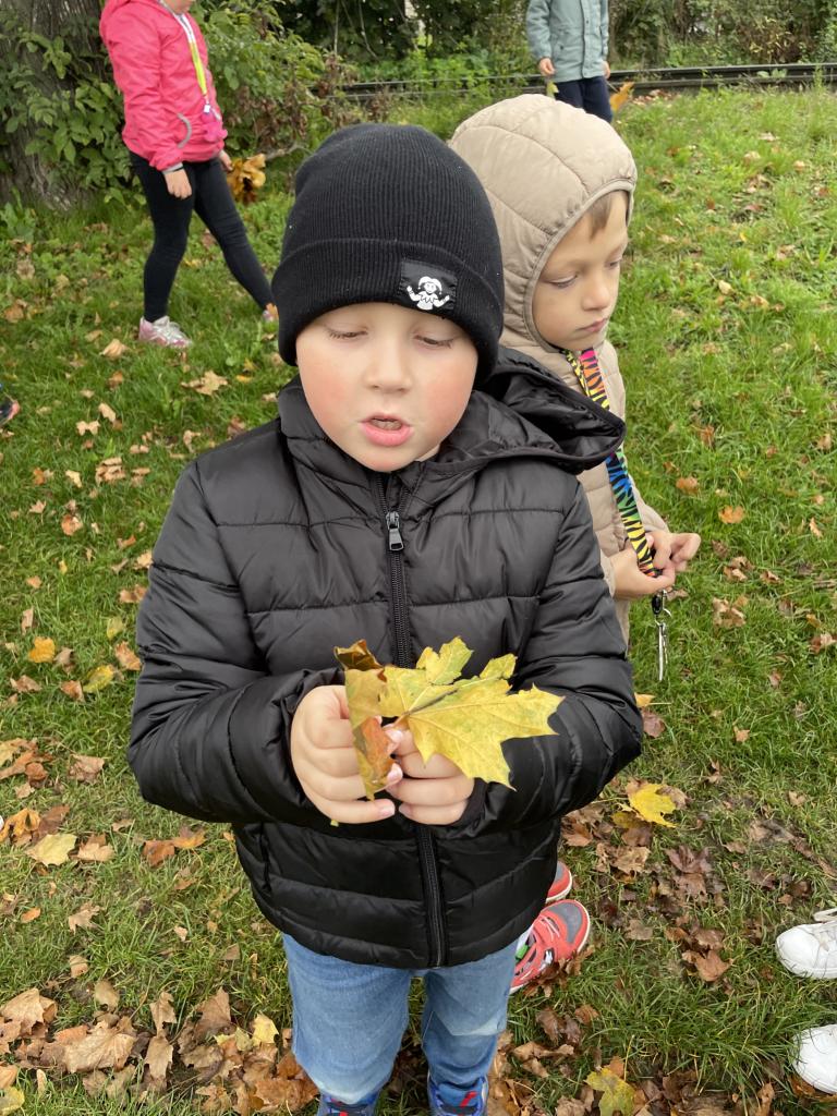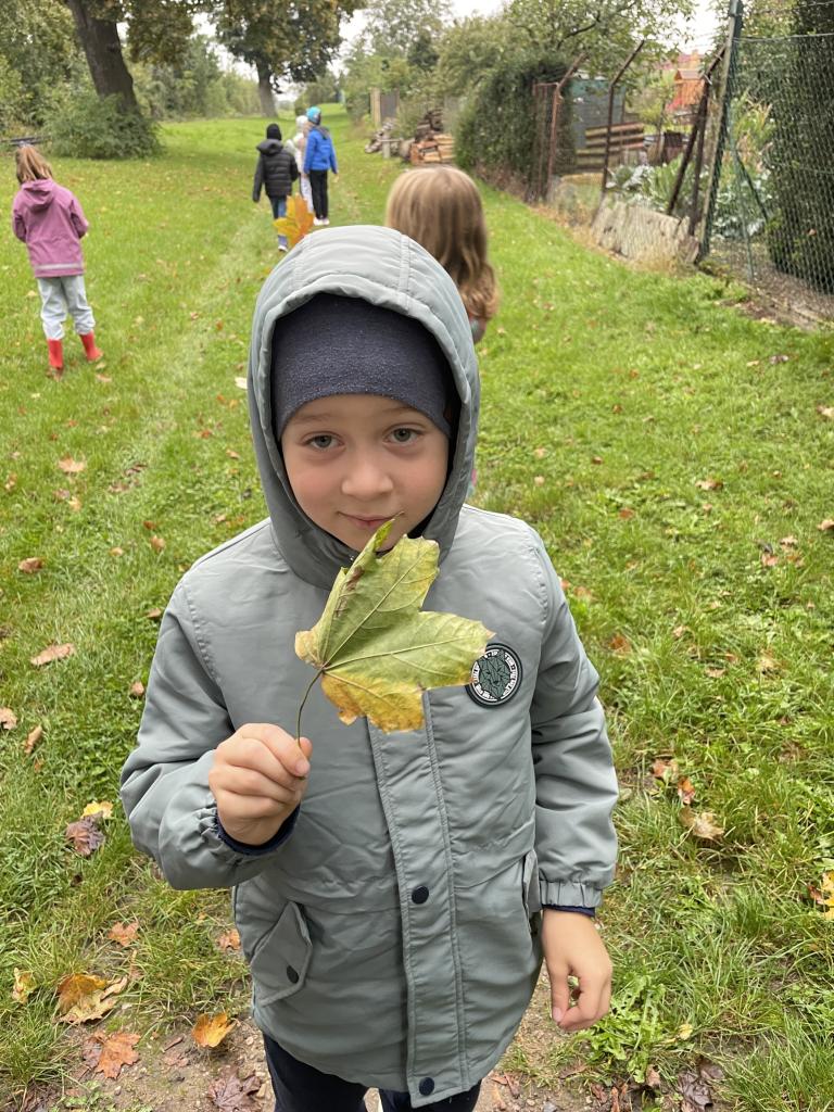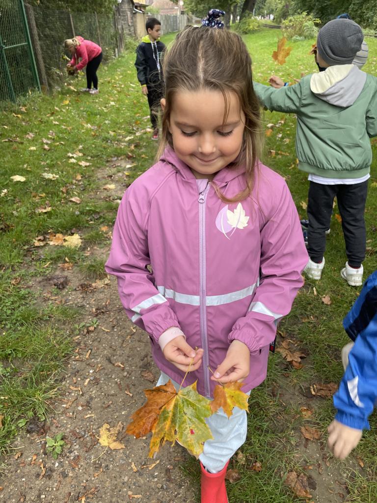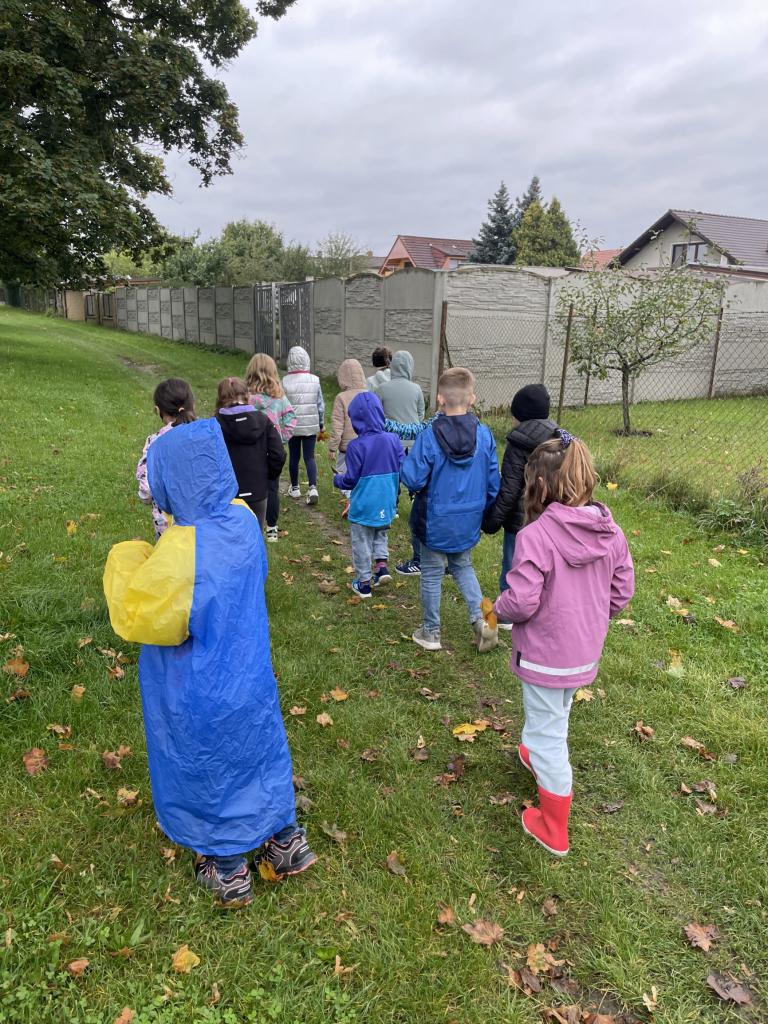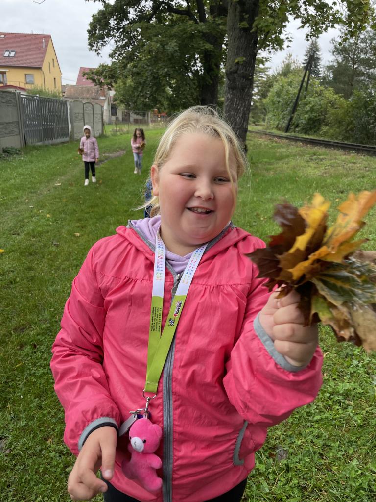 Podzimní téma jsme využili i k vycházce, během které jsme popisovali projevy podzimu v přírodě, pojmenovali jsme různé stromy a vytvořili jsme kytice z listí.