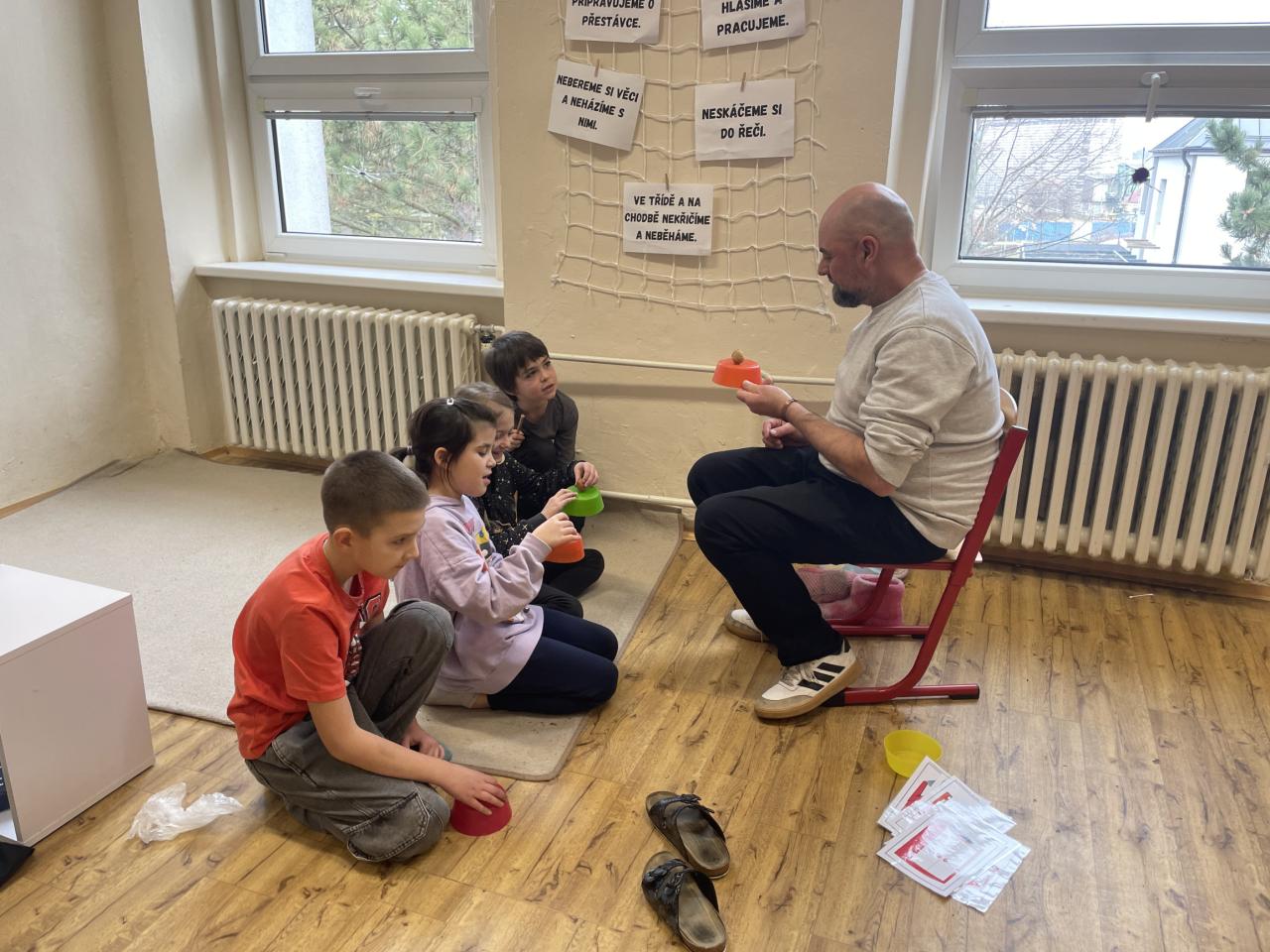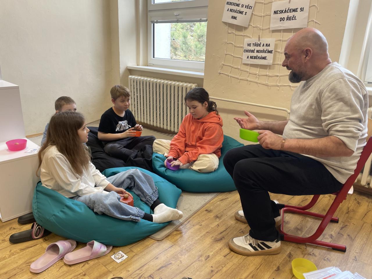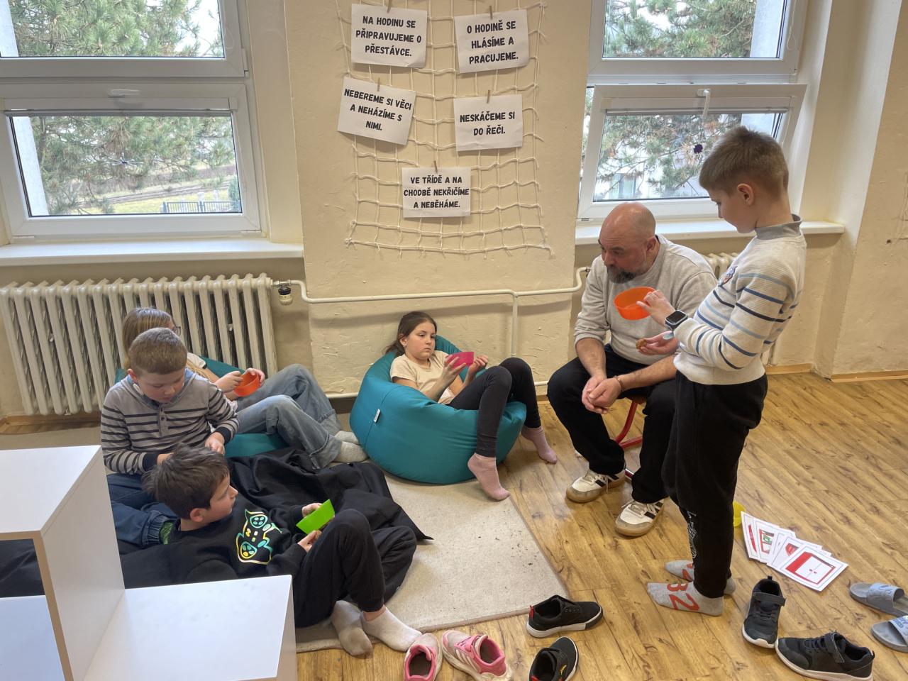 Výuka probíhala ve skupinkách, mezi kterými se žáci postupně střídali na stanovištích. Každé stanoviště nabízelo jiný typ úkolu – od popisování obrázků, přes pexeso s ovocem, skládání slov, až po jednoduché křížovky. Tímto způsobem si všichni vyzkoušeli práci v různých rolích a zároveň se více rozmluvili.