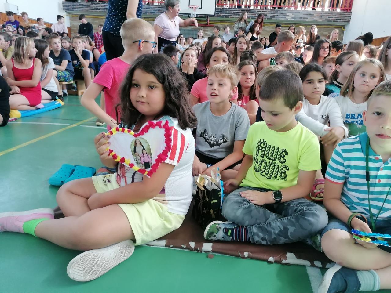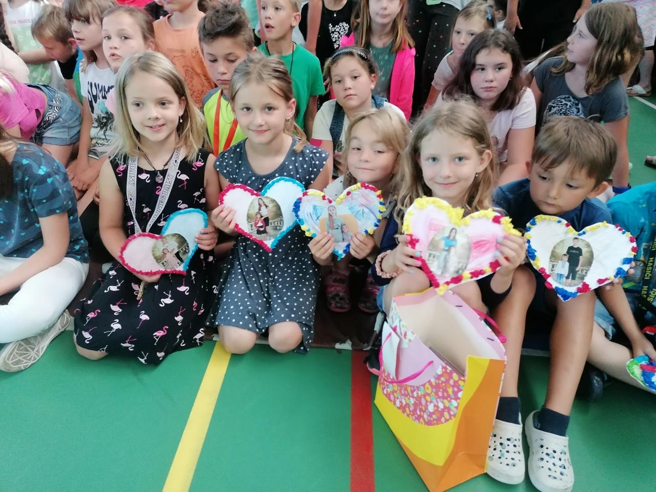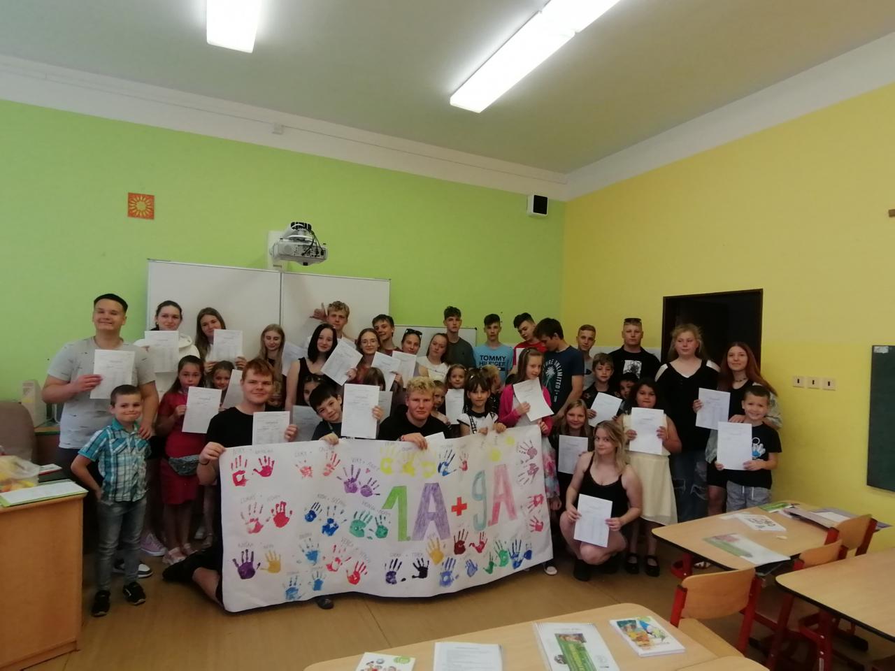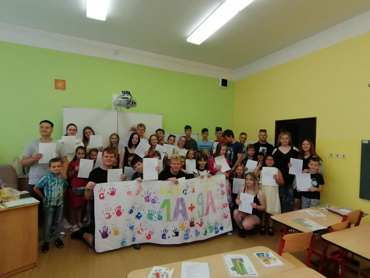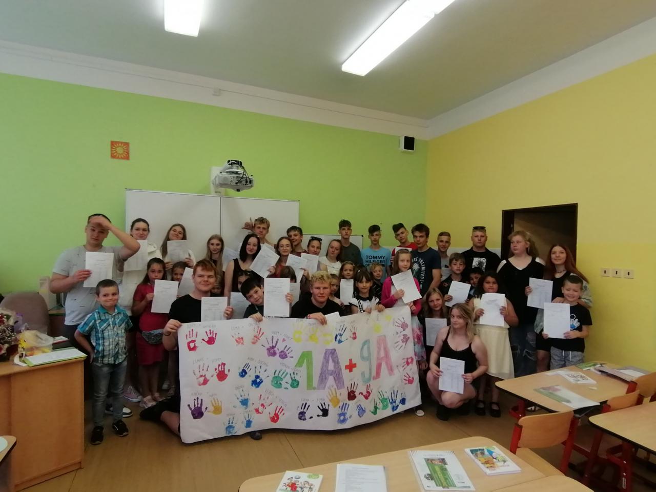Naši kamarádi z 9.A nám stihli ještě poslední týden ukázat, jak se pracuje v počítačové učebně. Ve čtvrtek jsme se s nimi rozloučili v tělocvičně a předali jsme jim vlastnoručně vyrobená srdíčka s fotkou na památku. V pátek se s námi ještě přišli vyfotit s vysvědčením. Přejeme jim hodně úspěchů.