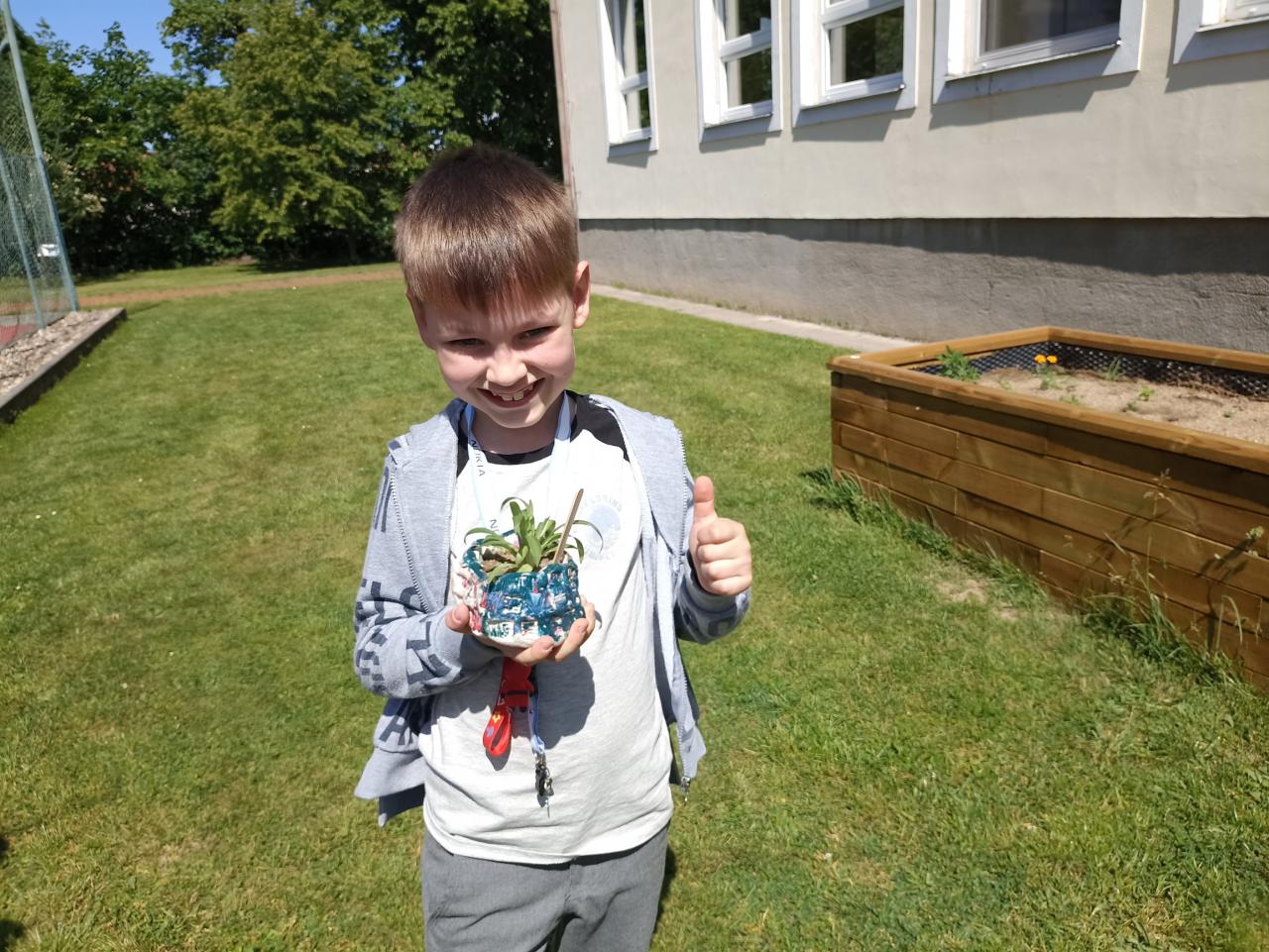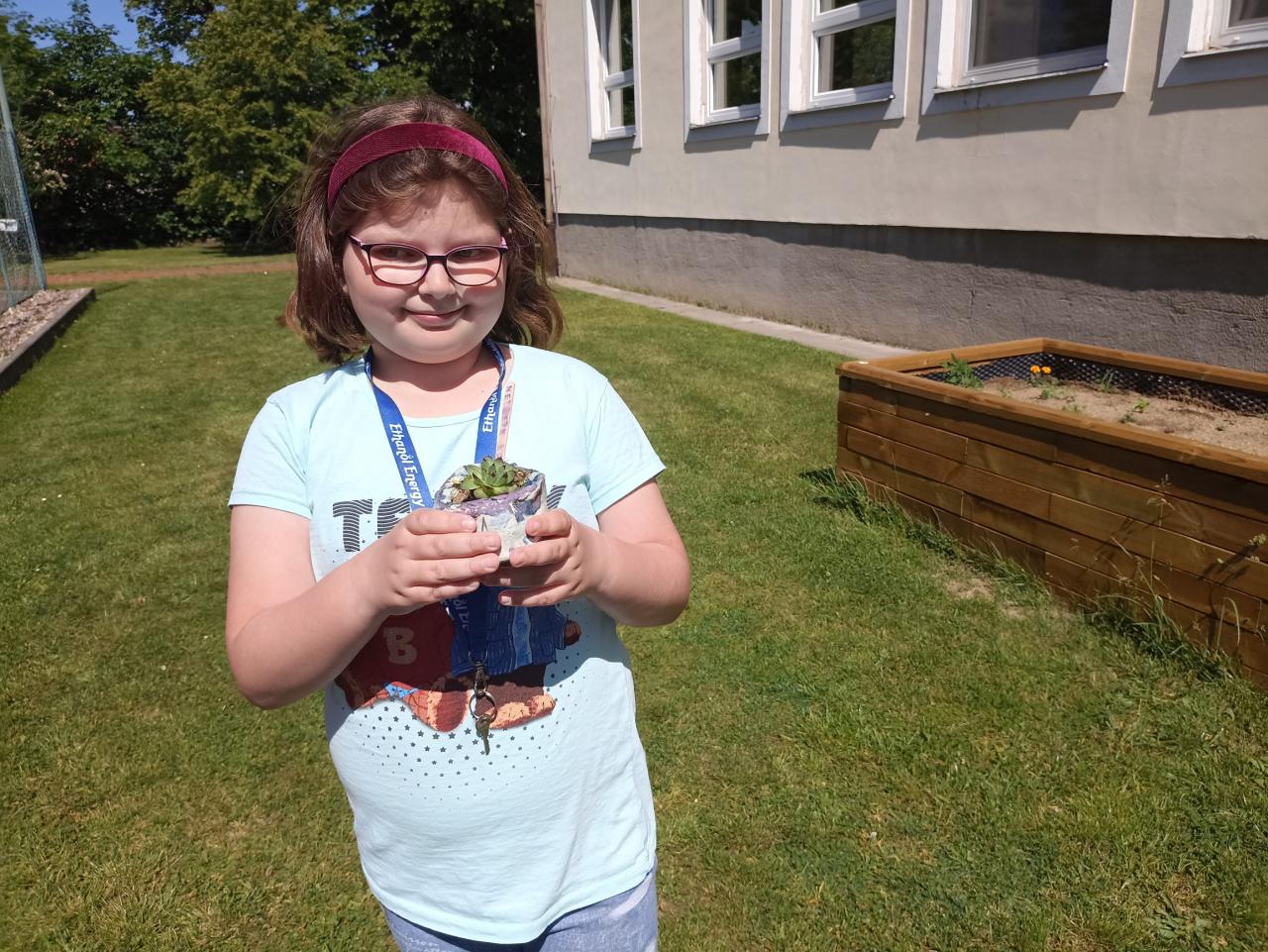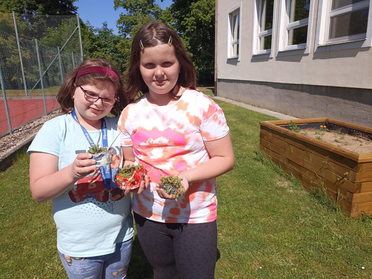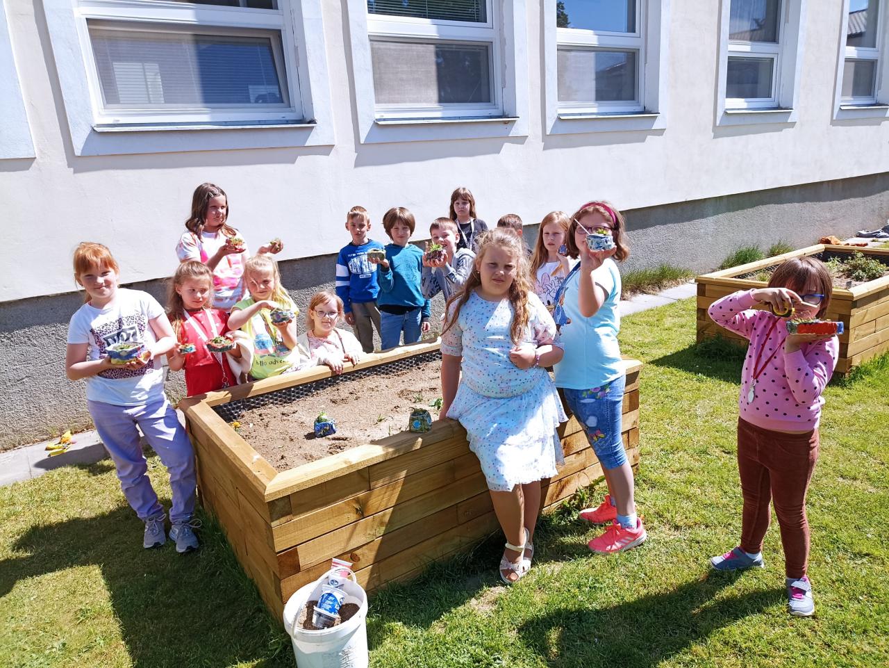 Keramické misky z našeho projektu jsou hotové, zbývá tedy je osázet květinami. Pustili jsme se do toho v krásně slunečný den, proto jsme využili prostoru u vyvýšených záhonů a užili si zároveň pěkného počasí.