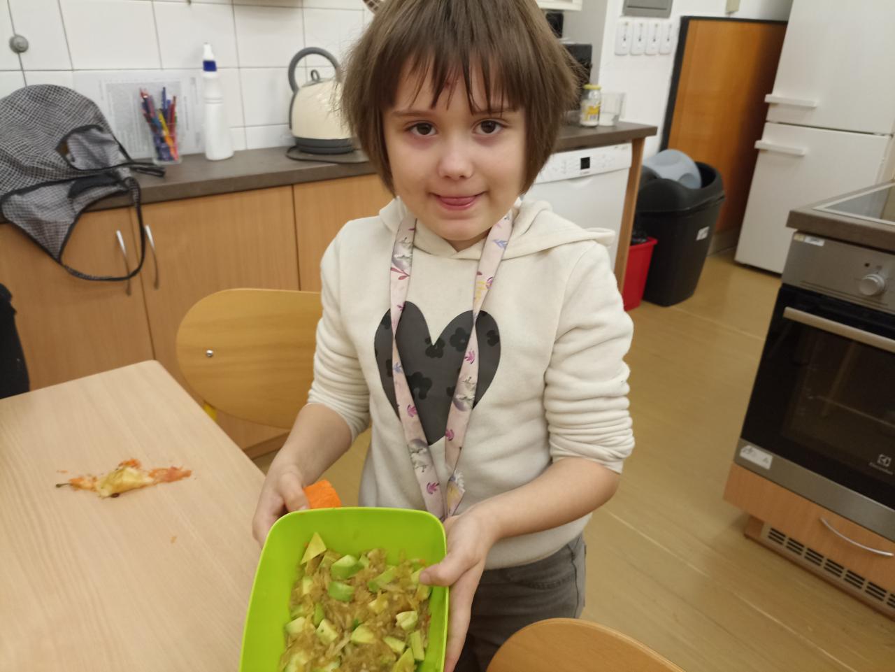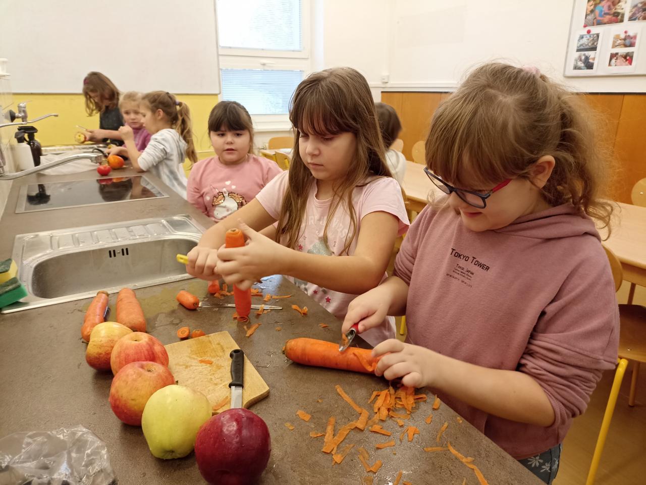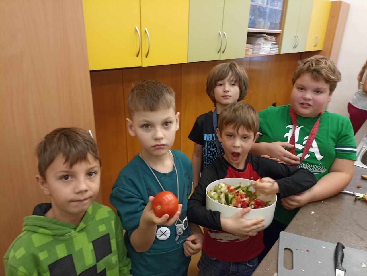 Co znamená, že se v prvouce učíme o ovoci a zelenině? Že se s ní musíme seznámit tváří v tvář a vyrobit si z ní salát. Podle druhu jsme se rozdělili do skupinek a vyrobili salát šopský, mrkvový s jablky i ovocné. Všechny byly výborné...