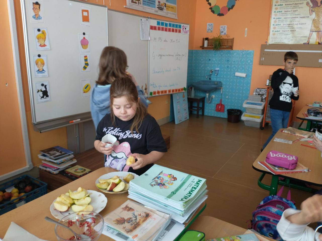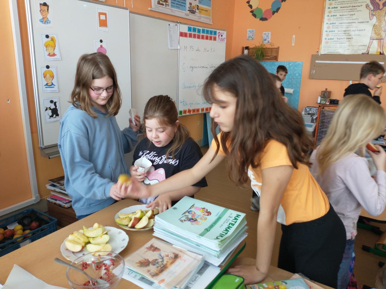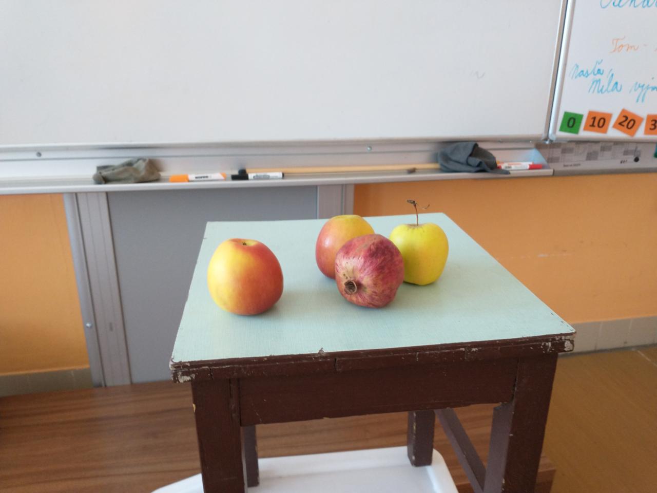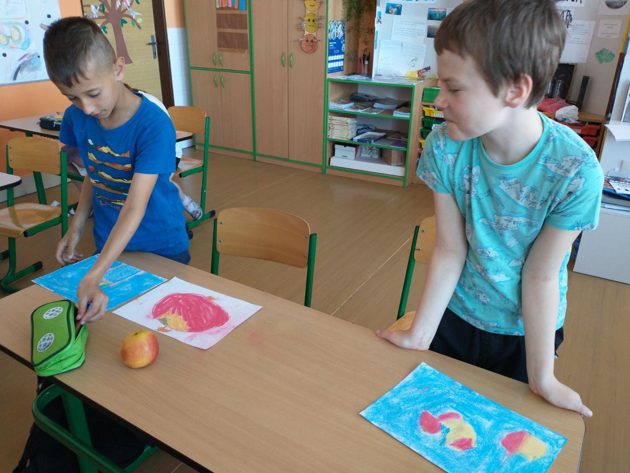 Letošní ochutnávku ovoce jsme propojili s výtvarnou výchovou. Na semínka granátového jablka jsme si složili kelímek. Zhodnotili jsme, který druh jablka získává v naší třídě nejvíc hlasů. A nakonec jsme si tu ovocnou dobrotu namalovali. Školní projekt Ovoce, mléko a zelenina do škol s Bovýskem-mňam.