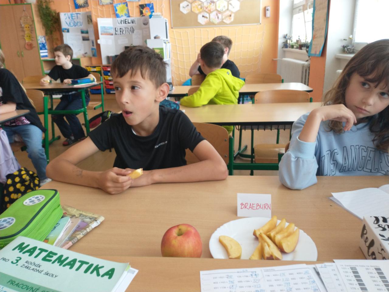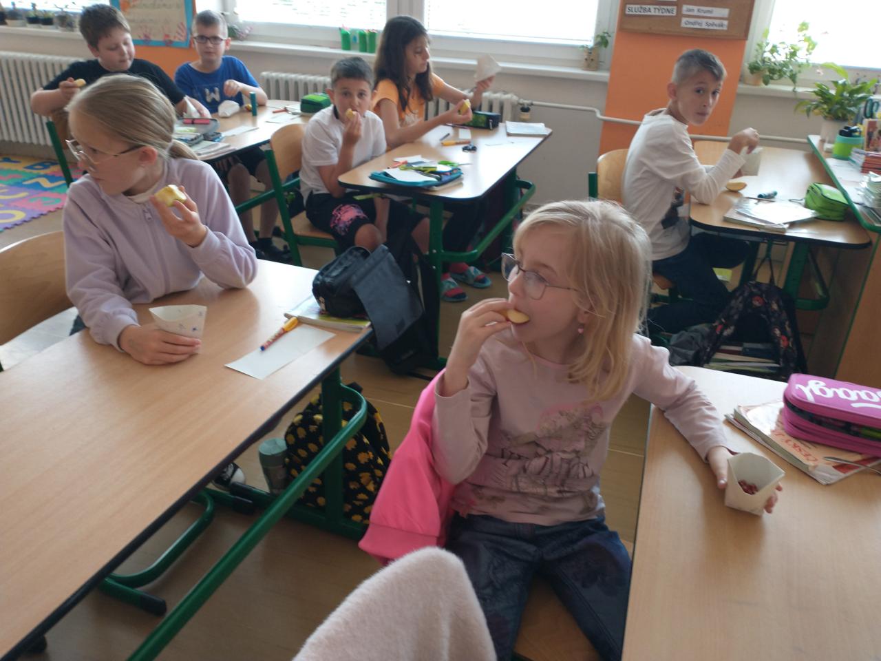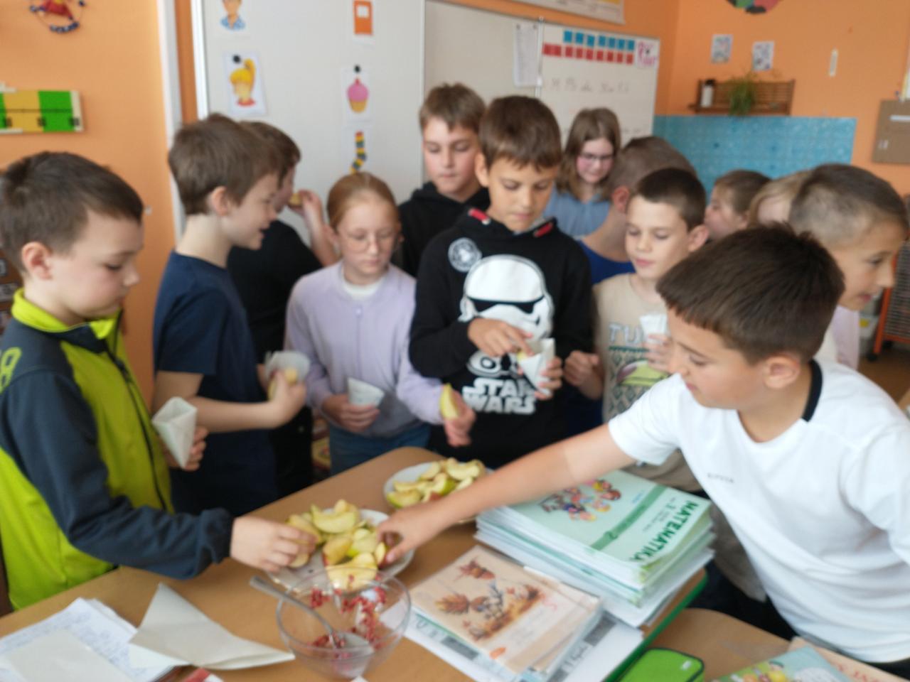 Letošní ochutnávku ovoce jsme propojili s výtvarnou výchovou. Na semínka granátového jablka jsme si složili kelímek. Zhodnotili jsme, který druh jablka získává v naší třídě nejvíc hlasů. A nakonec jsme si tu ovocnou dobrotu namalovali. Školní projekt Ovoce, mléko a zelenina do škol s Bovýskem-mňam.