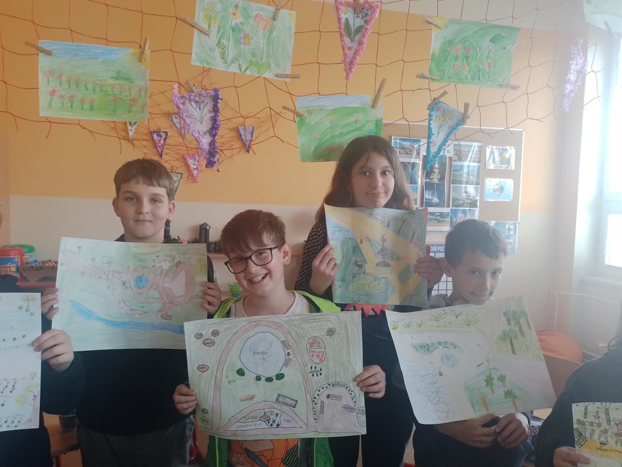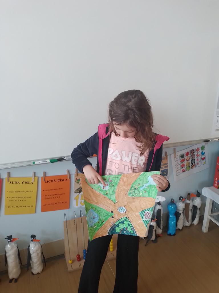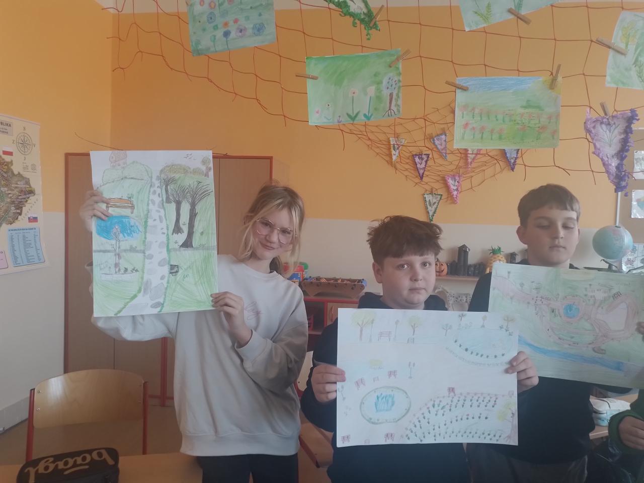 Hodina přírodovědy probíhala před Velikonocemi projektově. Čtvrťáci prezentovali a představovali ostatním graficky zpracovanou studii - vlastní návrh parku, se všemi odpočinkovými prvky. Součástí projektu bylo zařazení zástupců rostlin i živočichů, propojení živé a neživé přírody do ekosystému PARK.