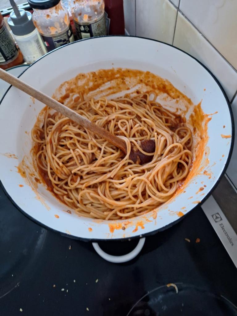 Uvařili jsme špagety s boloňskou omáčkou, rybí a vajíčkovou pomazánku, sladké jednohubky, upekli jsme slané šneky, malé pizzy a malinový bezlepkový koláč.