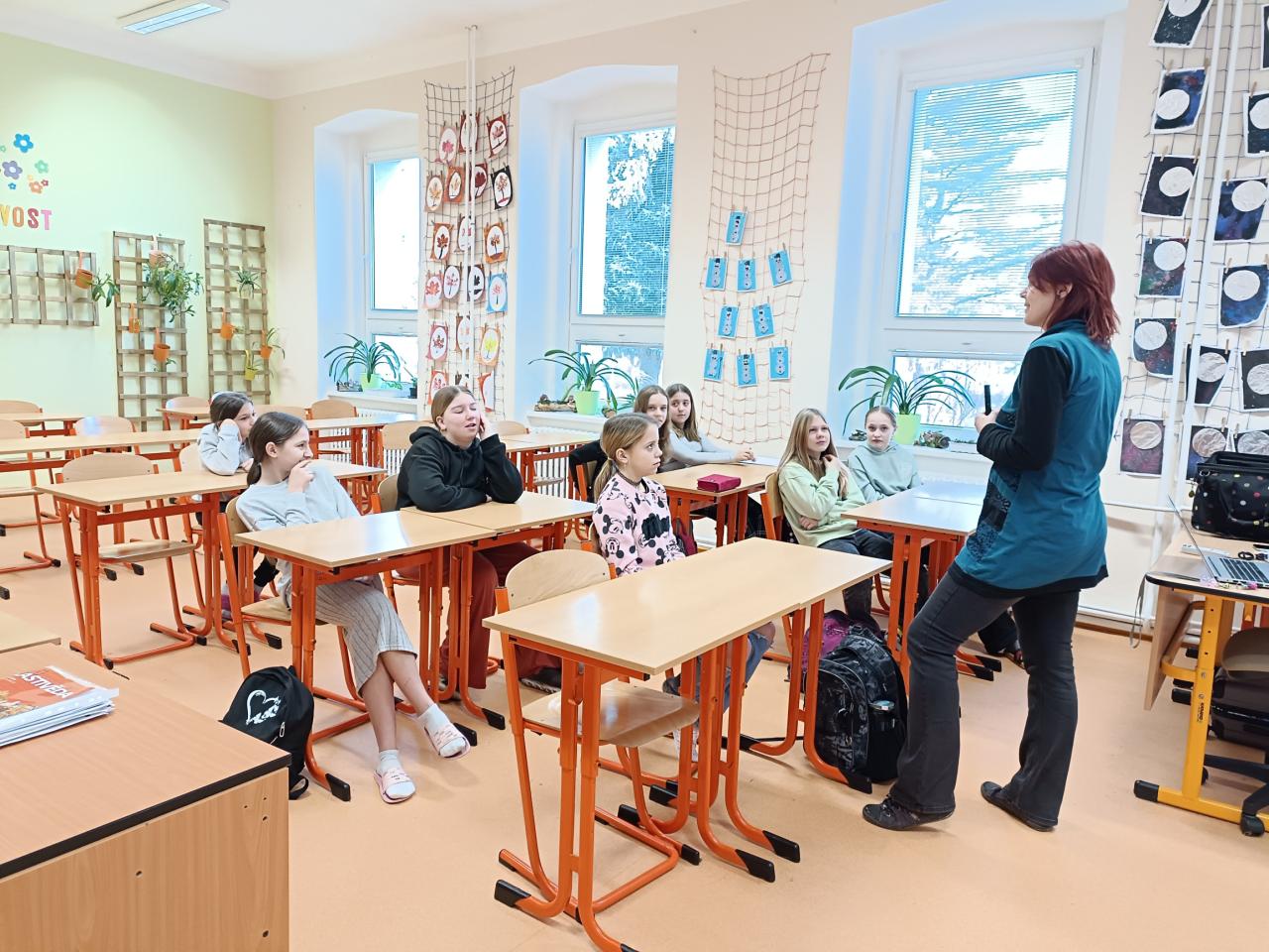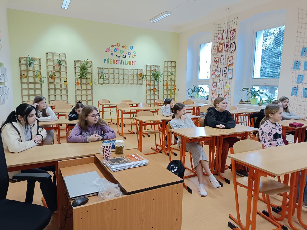 Žáci šestého ročníu absolvovali program „Čas proměn". Při besedách s podtituly "Mezi námi děvčaty“ a "Na startu mužnosti" lektorka poutavou formou přiblížila děvčatům i chlapcům problematiku dospívání, aby získali základní vědomosti o anatomii a fyziologii lidského těla.